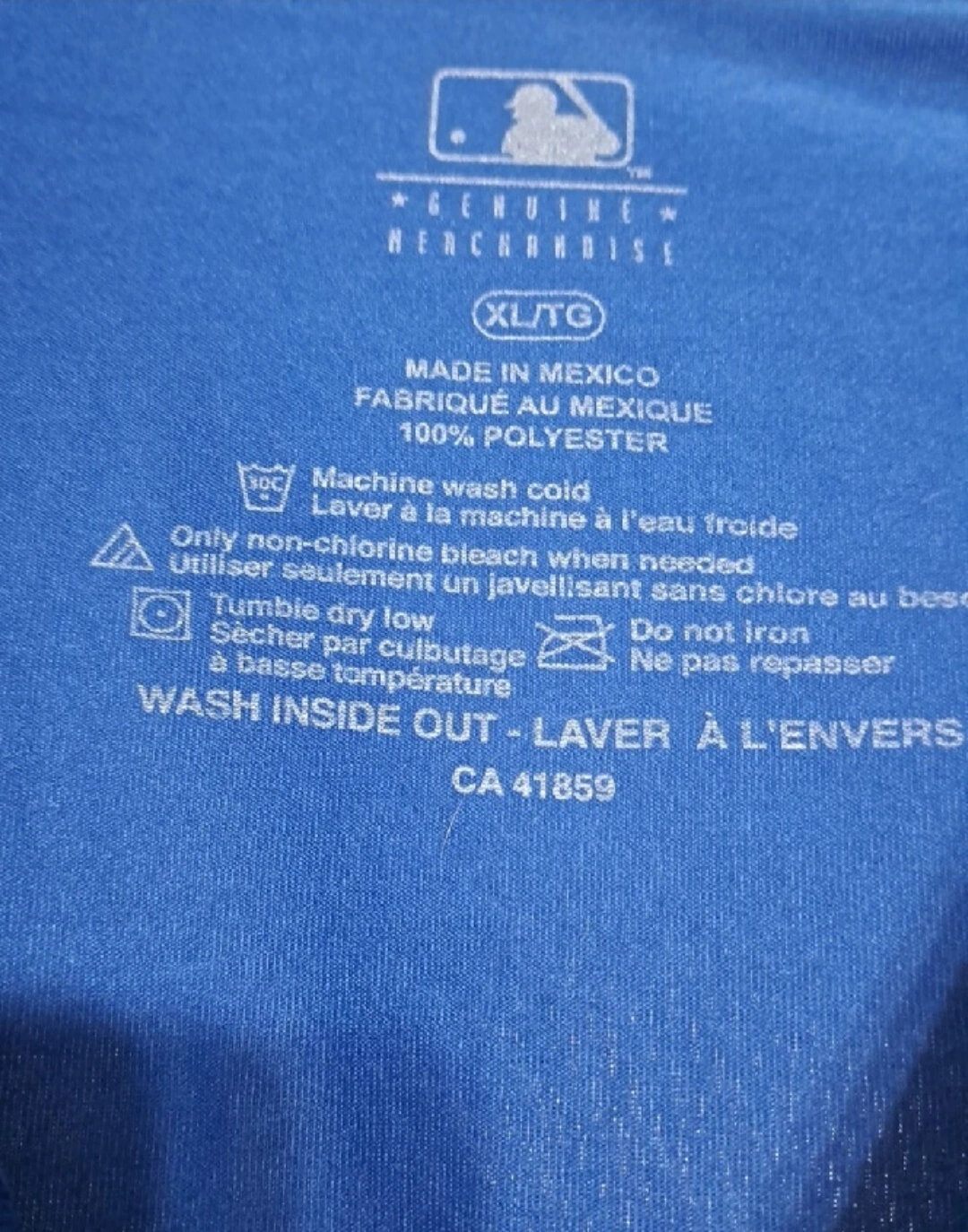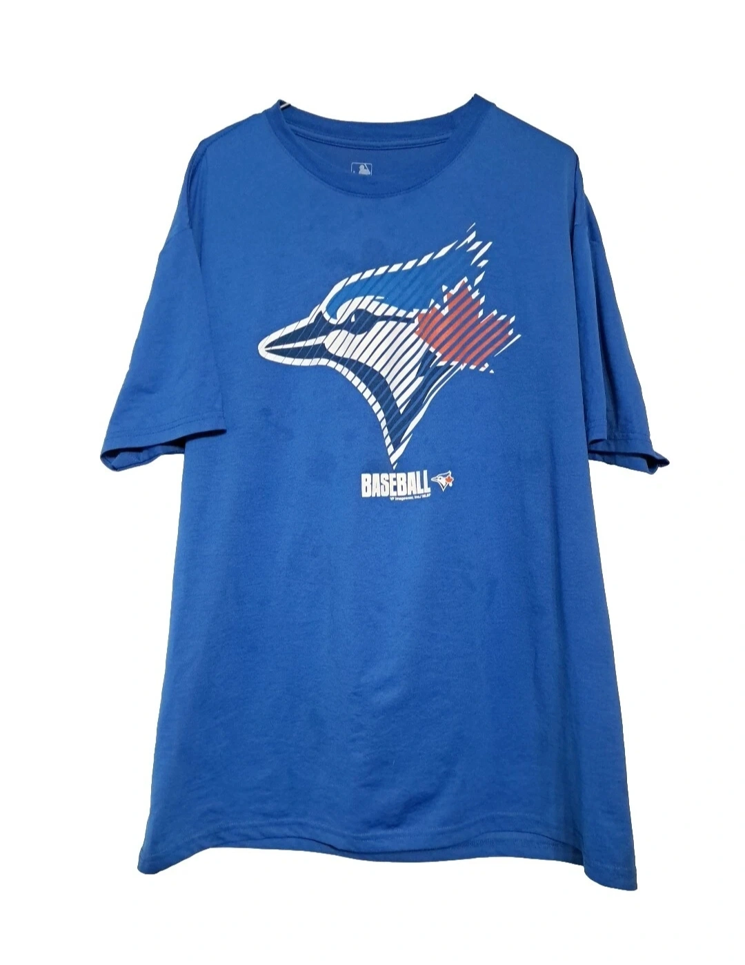 Selling a Toronto Blue Jays t-shirt in size XL. It's a vibrant blue and made of 100% polyester. The shirt features the Blue Jays logo with a maple leaf design. Perfect for showing your team spirit!