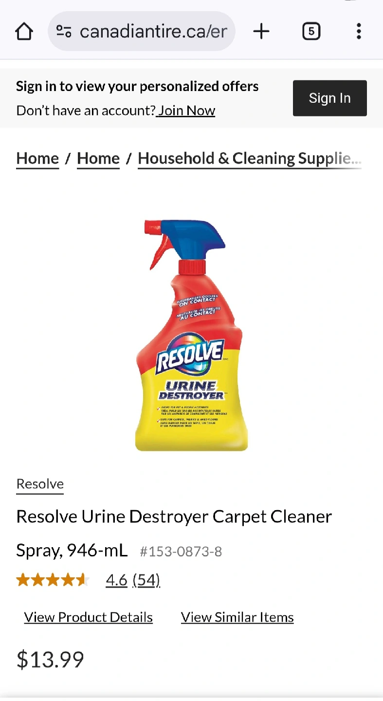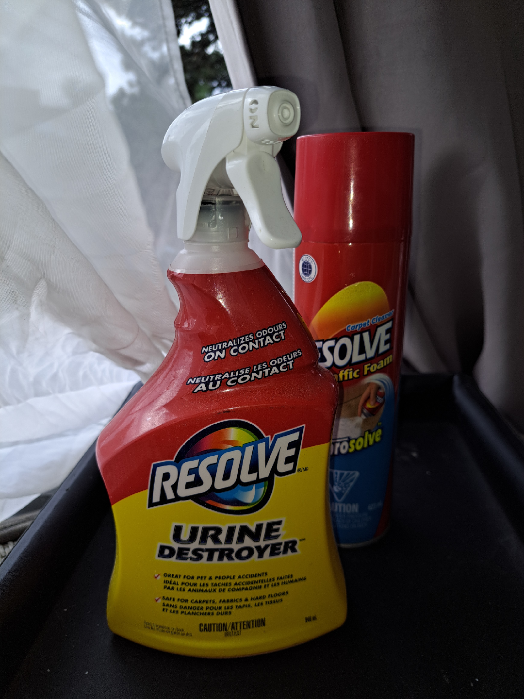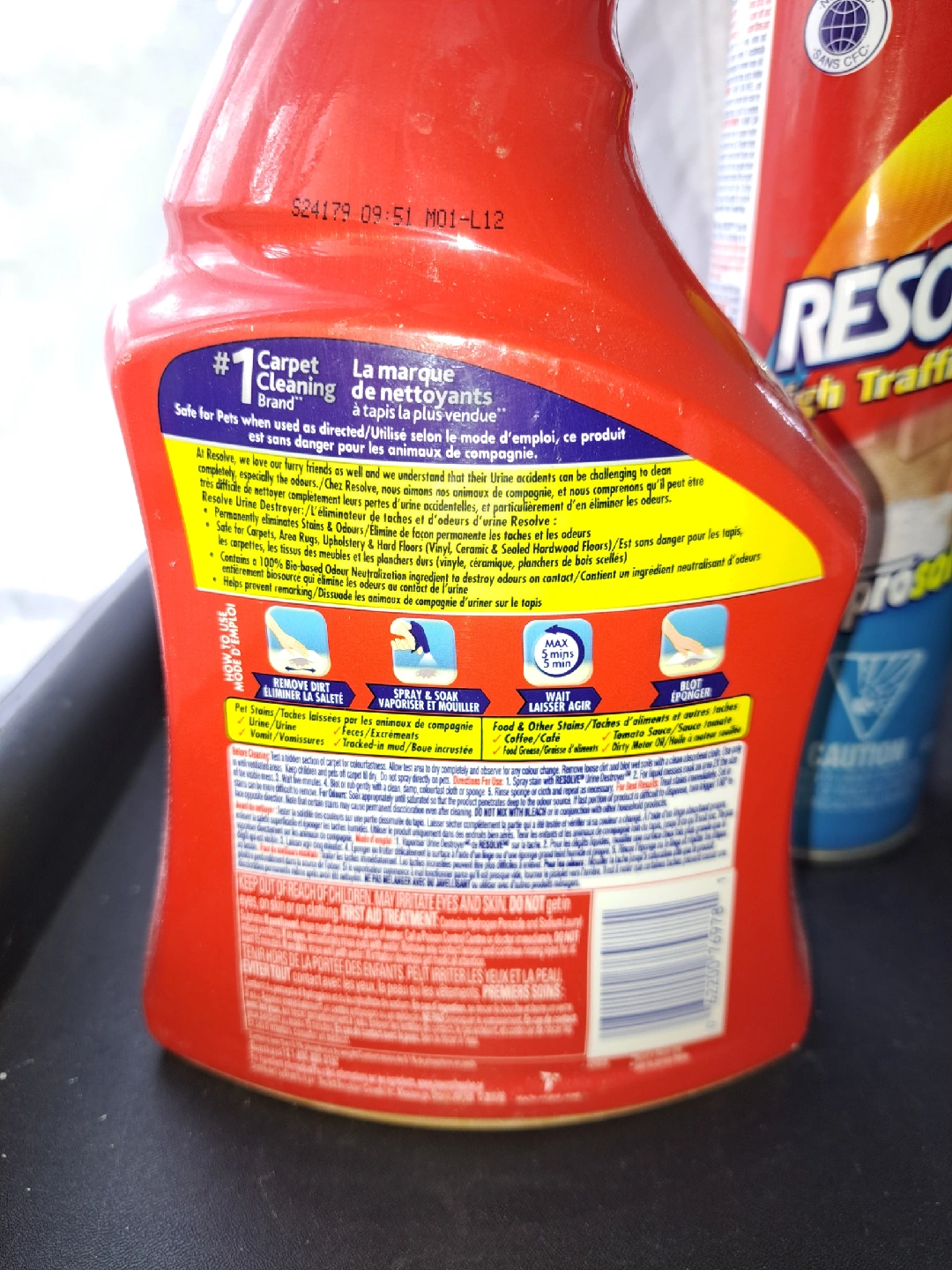 Selling a bottle of Resolve Urine Destroyer and Resolve High Traffic Foam Carpet Cleaner. Perfect for keeping your carpets clean and fresh! The Urine Destroyer neutralizes odours on contact, and the High Traffic Foam is great for large areas.