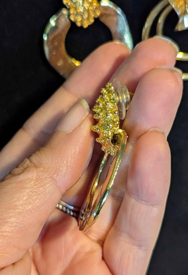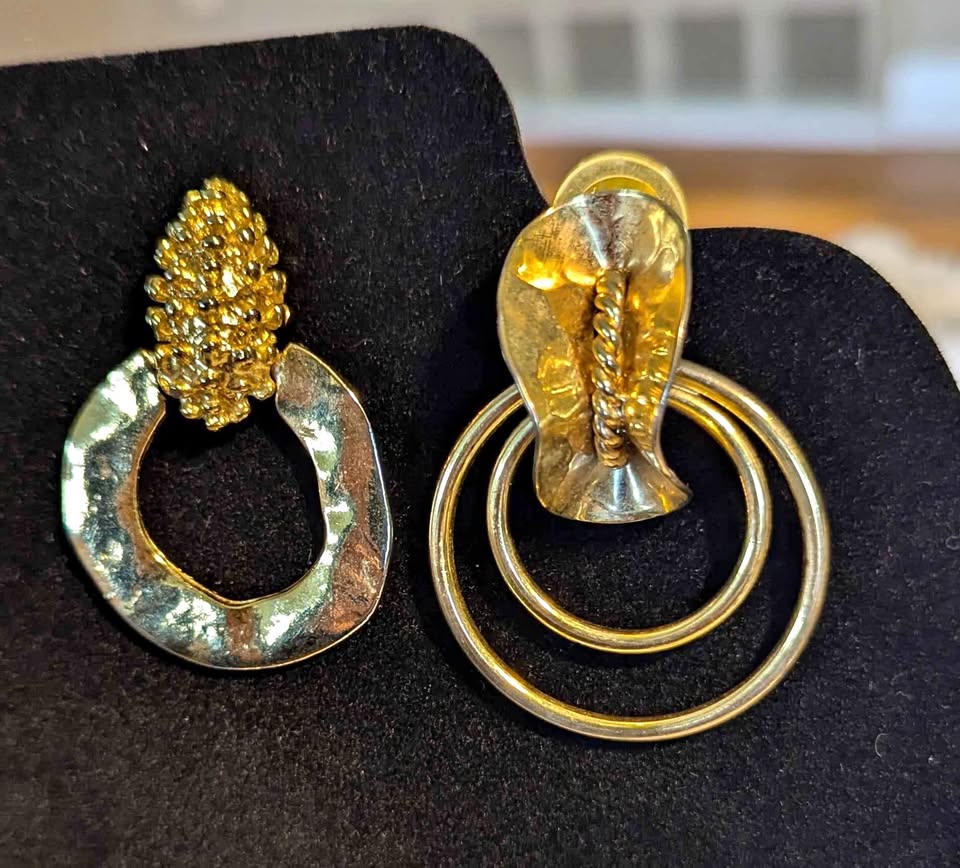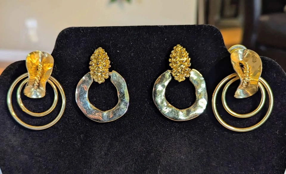 Chic set of two pairs of vintage-inspired gold-tone earrings, both with an artistic, hammered finish and bold geometric shapes. These are somewhat lighter weight and are very eye-catching β perfect for collectors or lovers of retro runway-style jewelry.