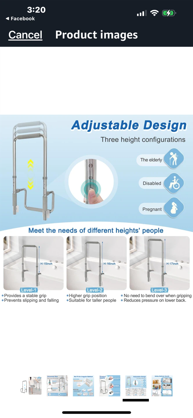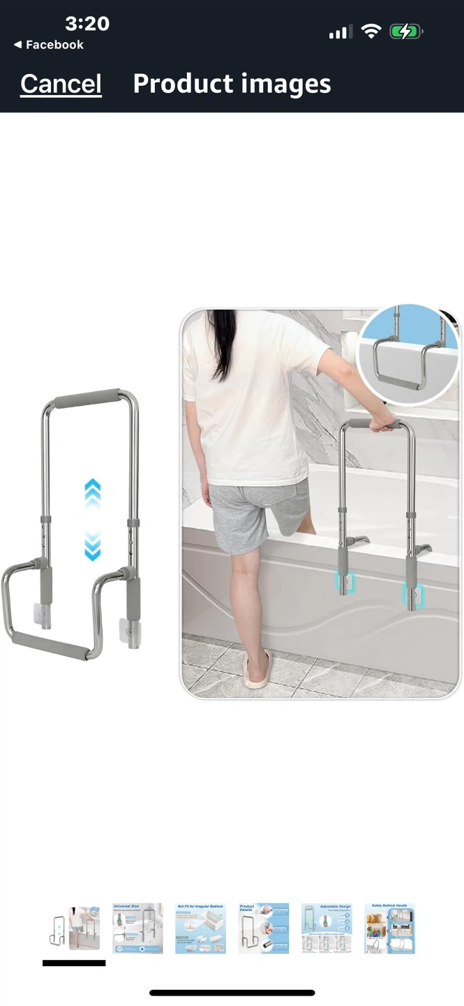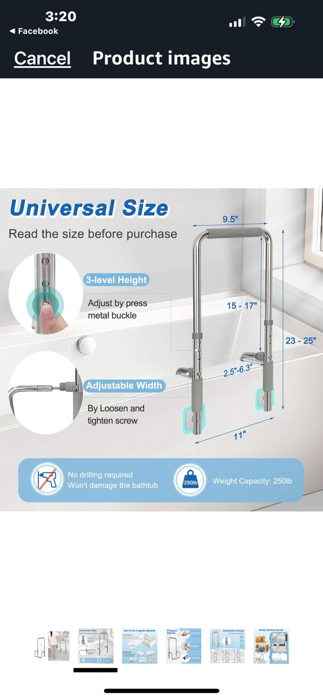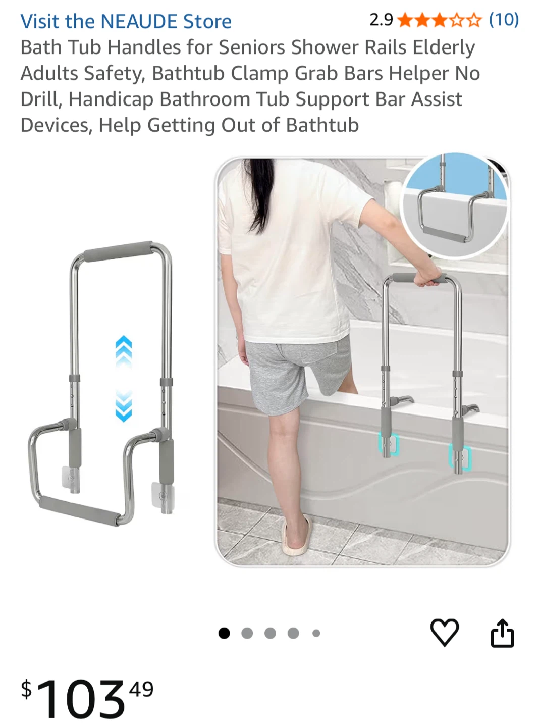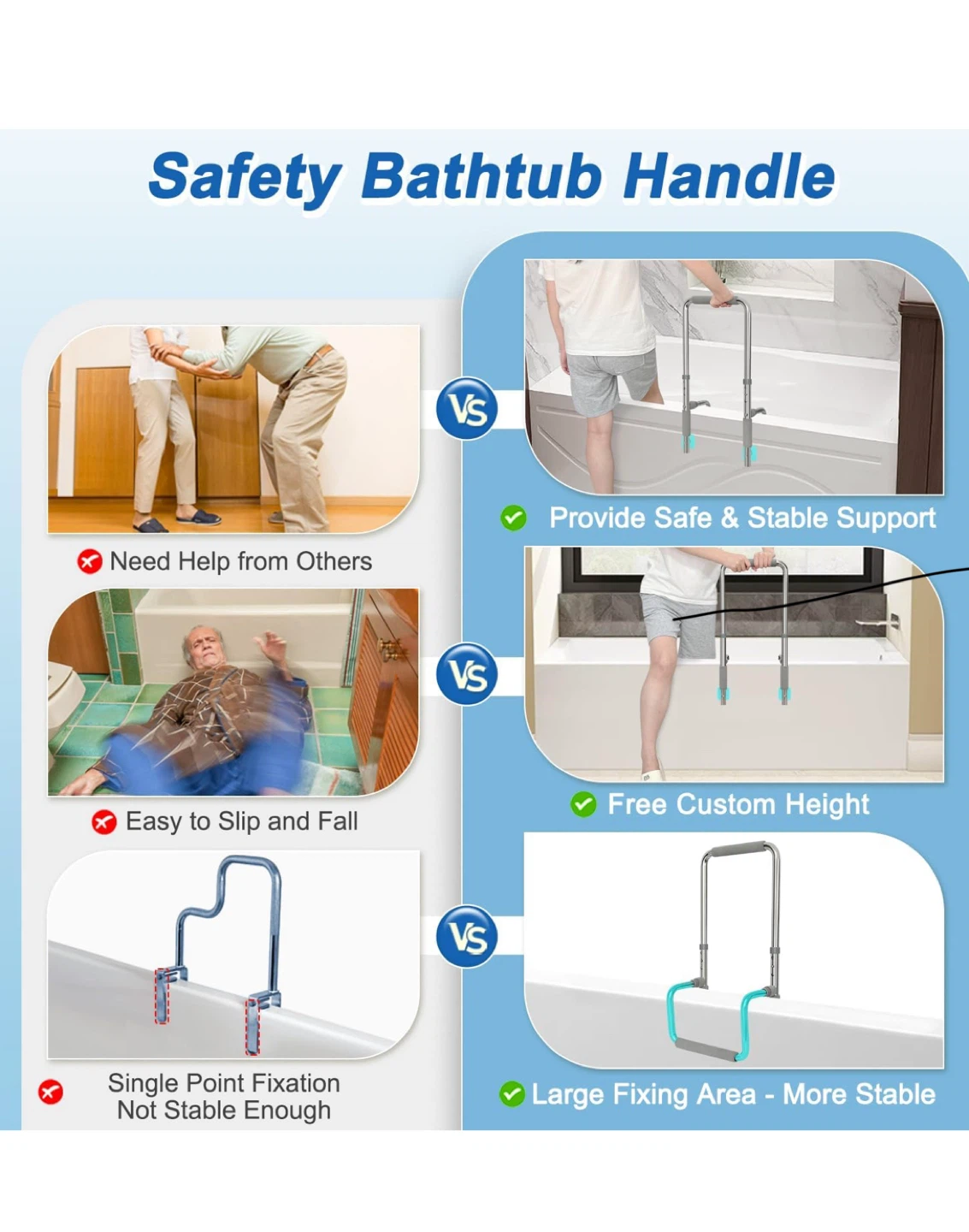 Selling a NEAUDE bathtub safety grab bar. It's designed for seniors and adults to provide safety and support in the bathroom. It requires no drilling and won't damage the bathtub. It's compatible with bathtubs that have 2.5-6.3" wide regular walls and flat tops. The frame is made of stainless steel, and it has foam pad covers that are soft and non-slip. It has adjustable height (15-17" or 23-25") and adjustable width. It can support up to 250lb