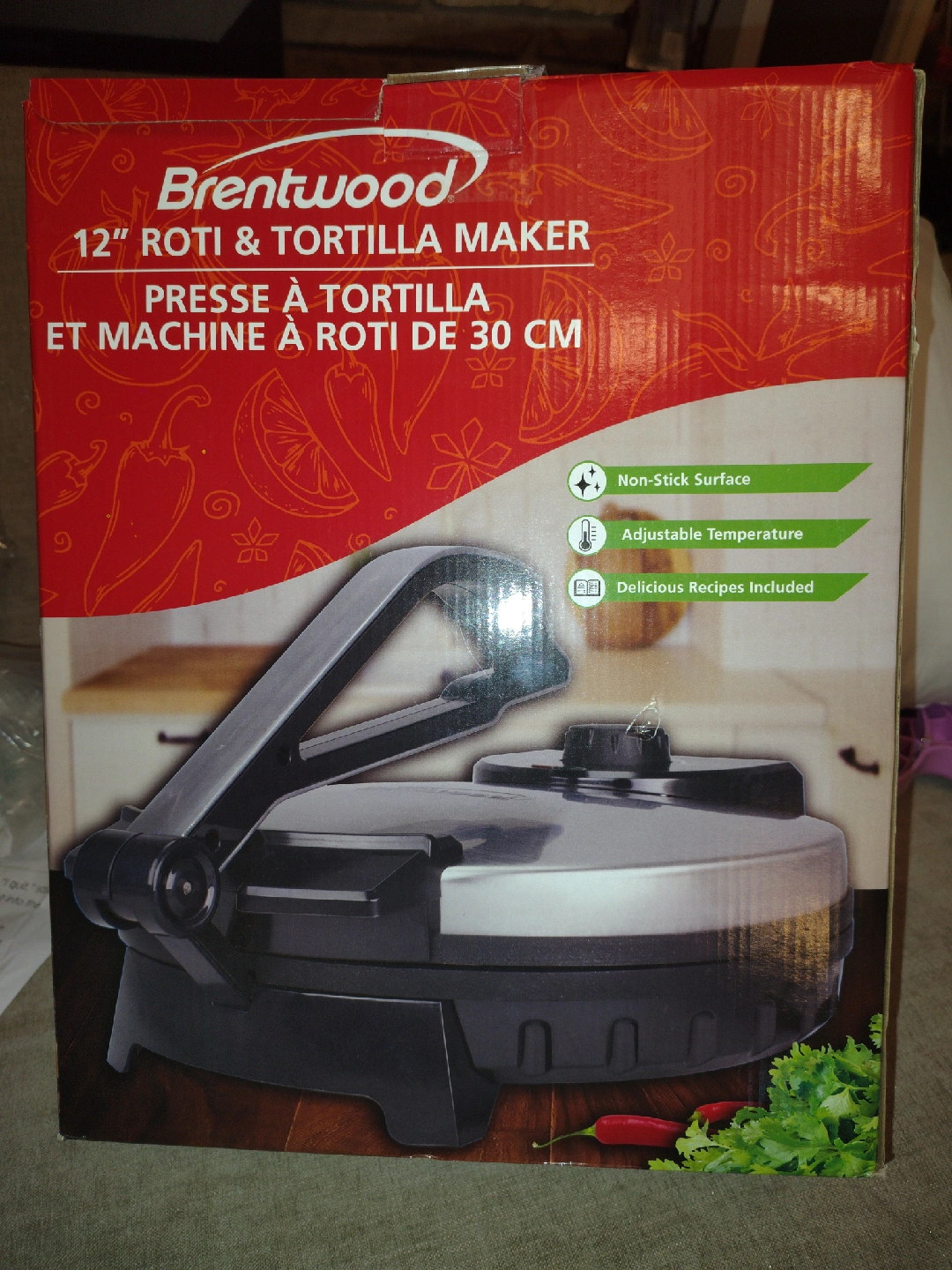 I'm selling a Brentwood 12" Roti & Tortilla Maker. It features a non-stick surface and adjustable temperature. Delicious recipes are included. Make your own tortillas at home!