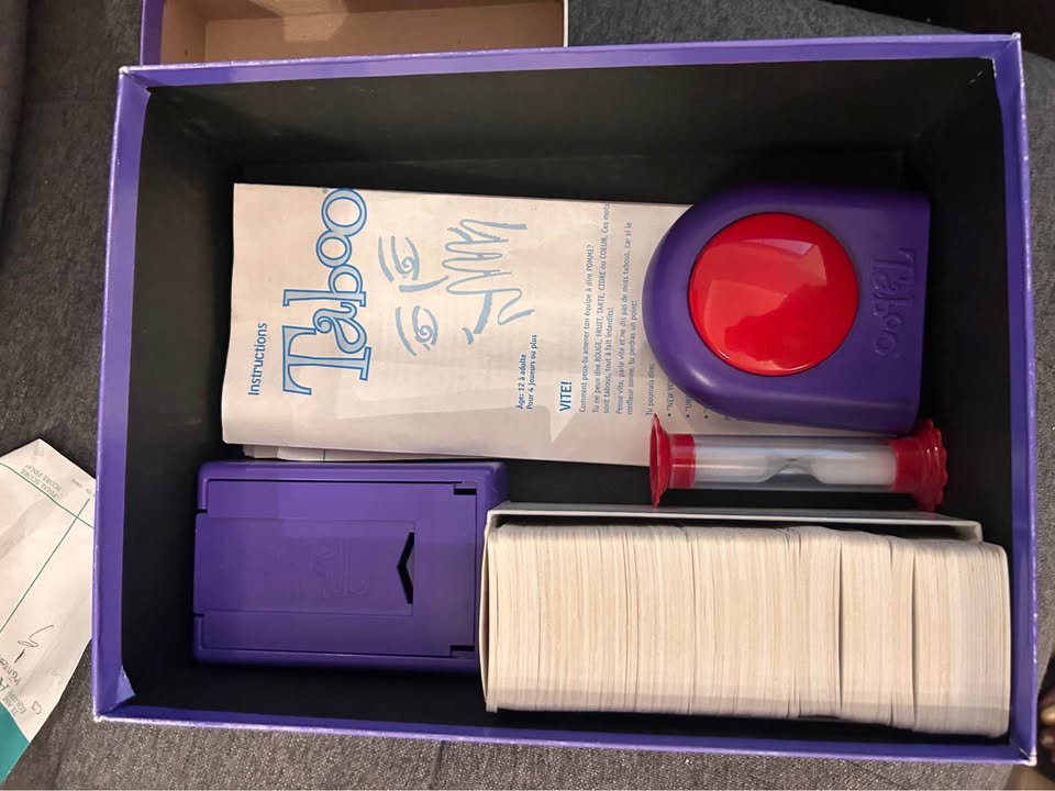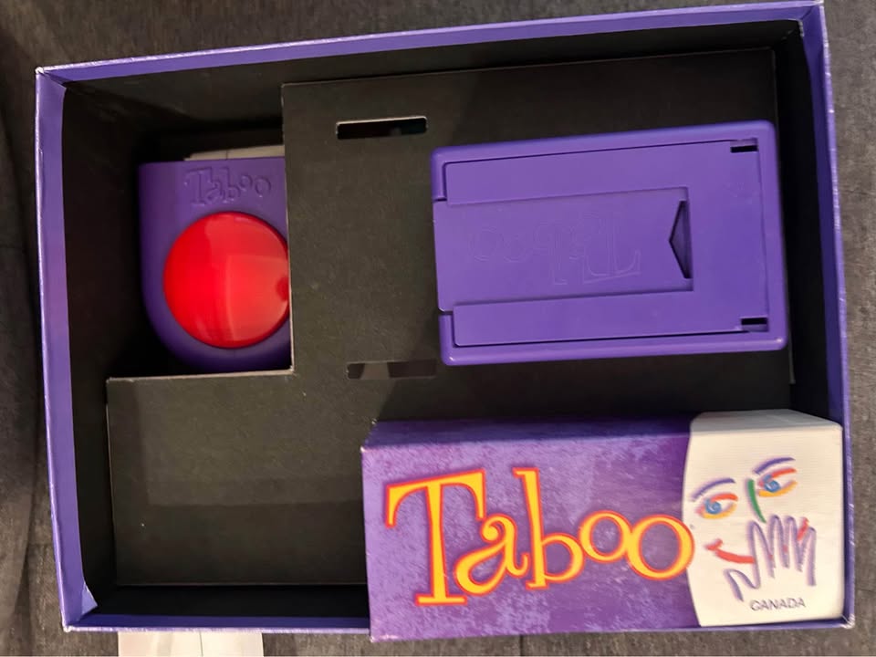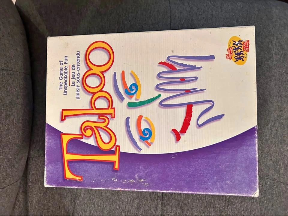 Selling a Taboo board game! It comes complete with the buzzer, cards, and instructions. Perfect for family game night or get-togethers with friends. Pick up near Bay and Temperance.