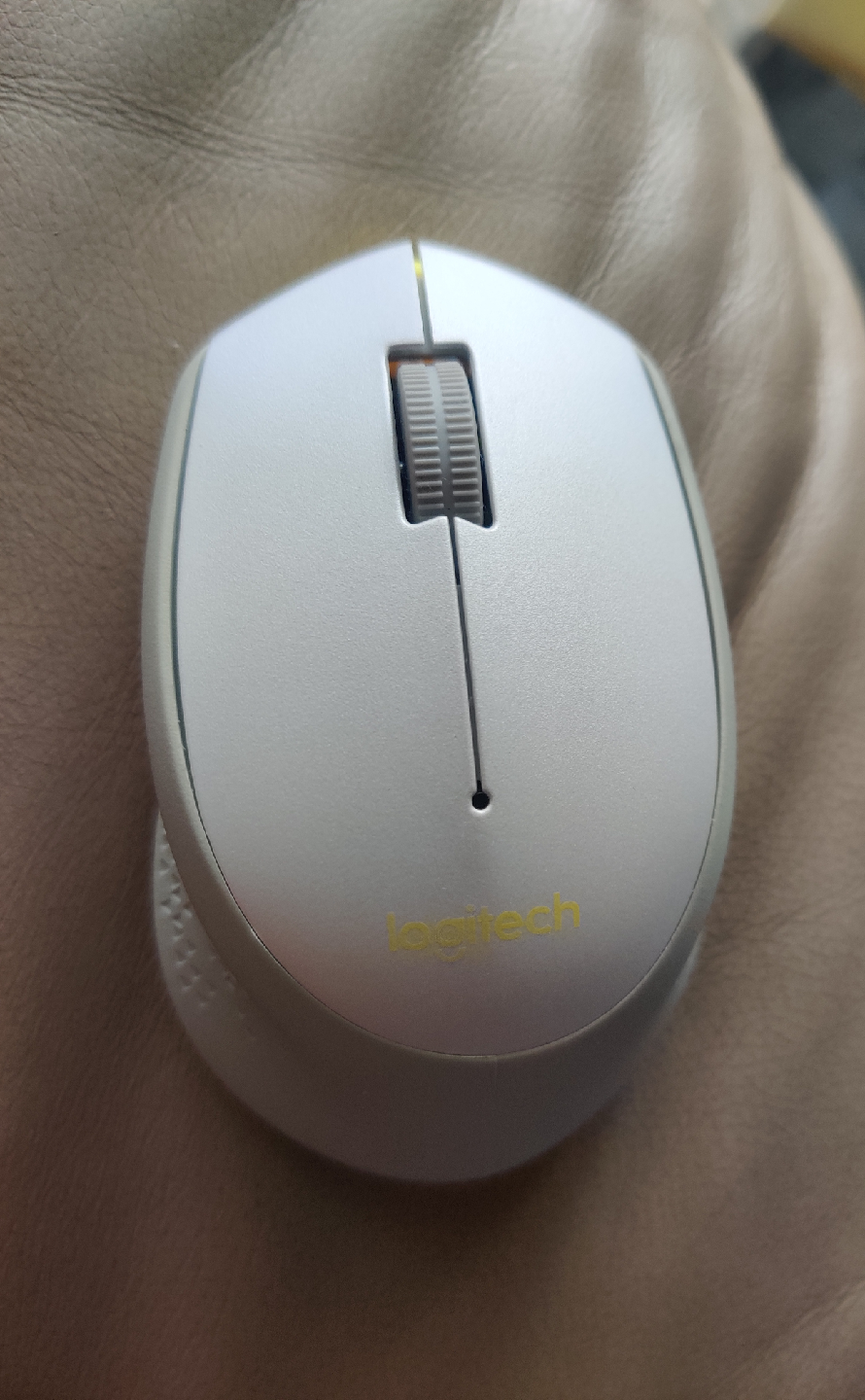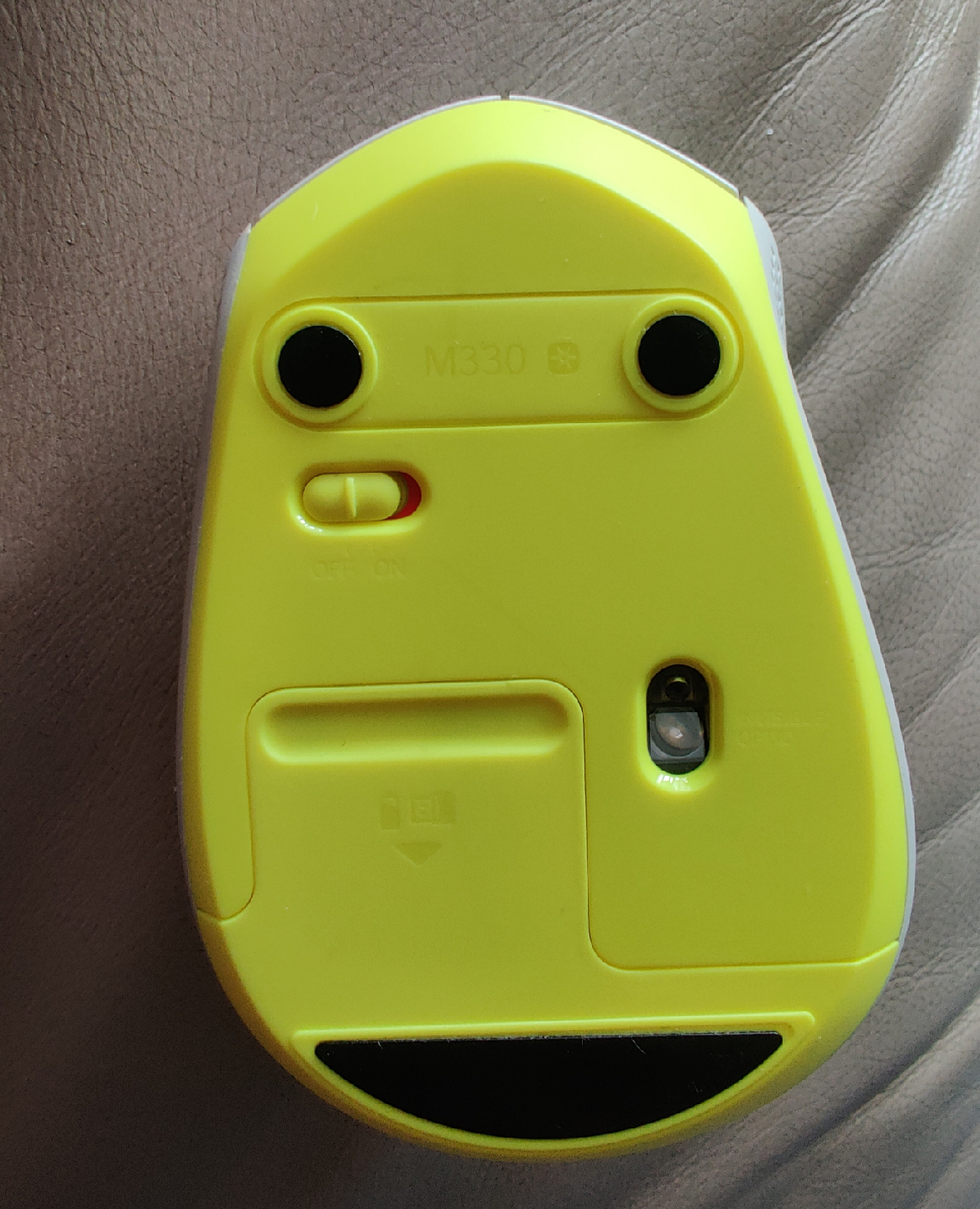 Selling a Logitech M330 Silent Plus wireless mouse. It's in great condition and ready to use! The bottom is yellow and the top is white. It features an on/off switch and requires one AA battery.