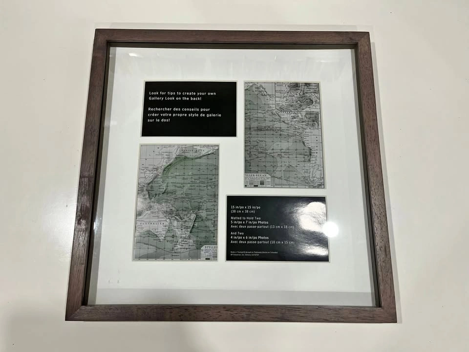 10Selling a Brand New Grey Brown 15" x 15" Frame. Purchased from HomeSense and never ended up using. Matted to Hold: Two 5" x 7" Photos and Two 4" x 6" Photos