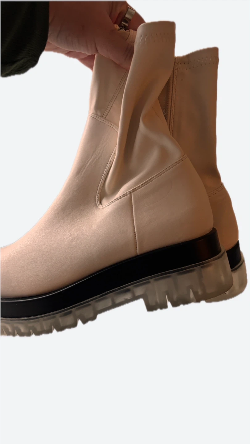 These ankle boots feature a unique clear sole and a stylish beige colour. They're perfect for adding a trendy touch to any outfit!