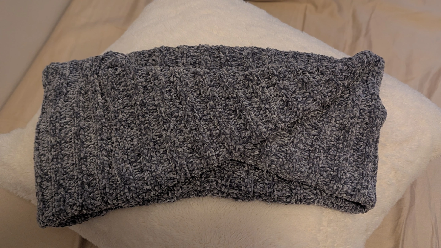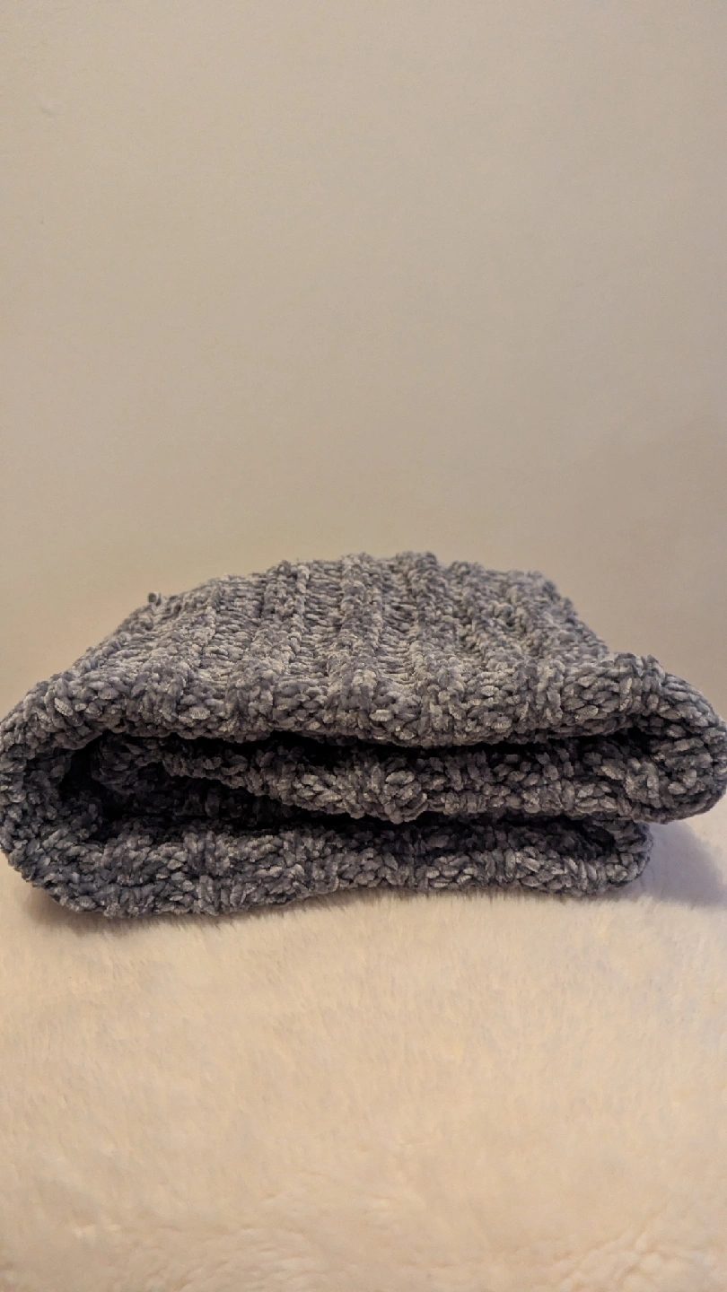 Here's a soft and cozy chenille scarf! The chenille material is super soft and feels like a cloud. it's in a beautiful grey knit style. Its a wrap scarf.
