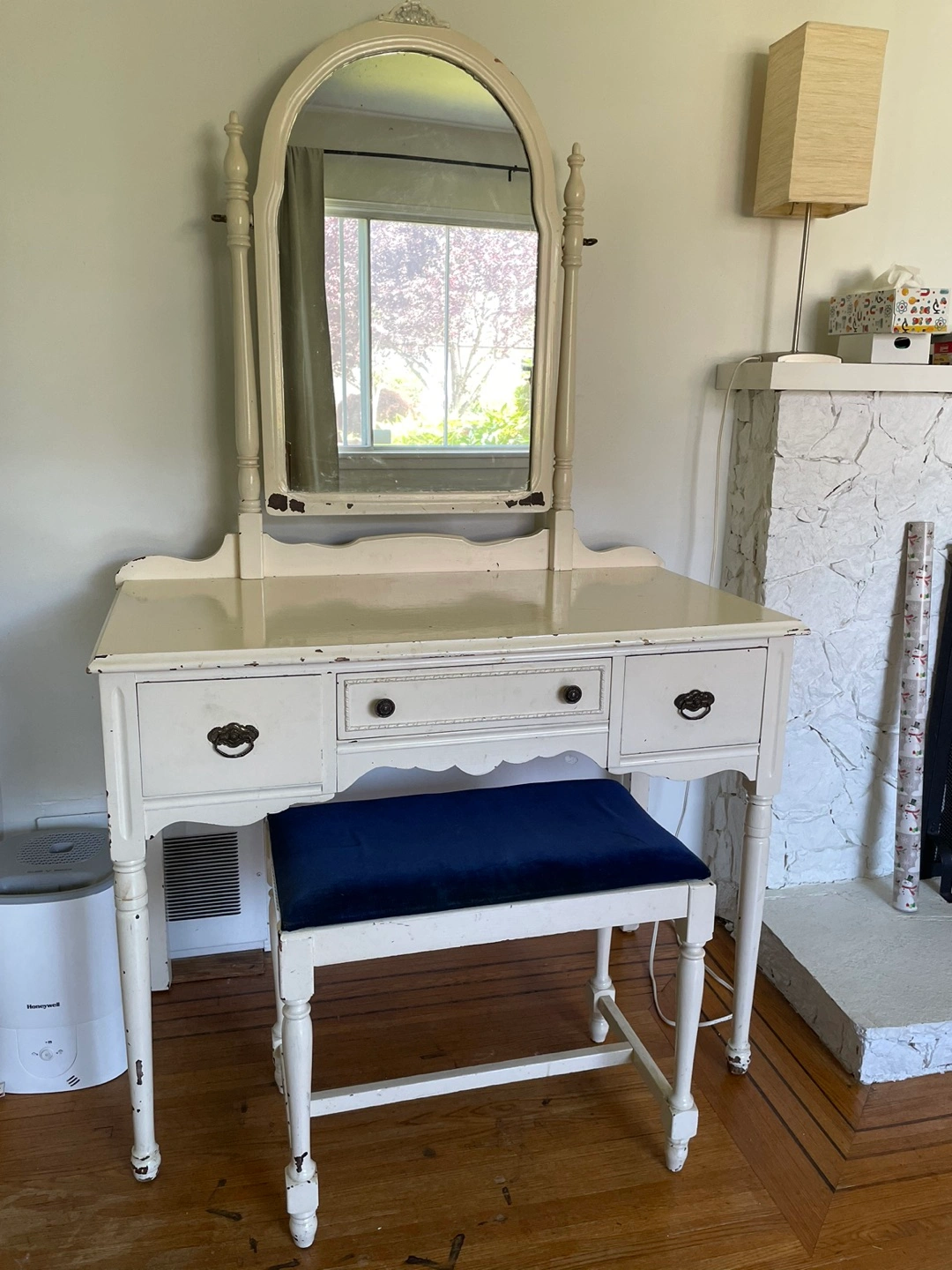 Beautiful vintage make up table with blue velvet bench. Needs a little touch up paint and love if you want it perfect, but otherwise solid and in great shape