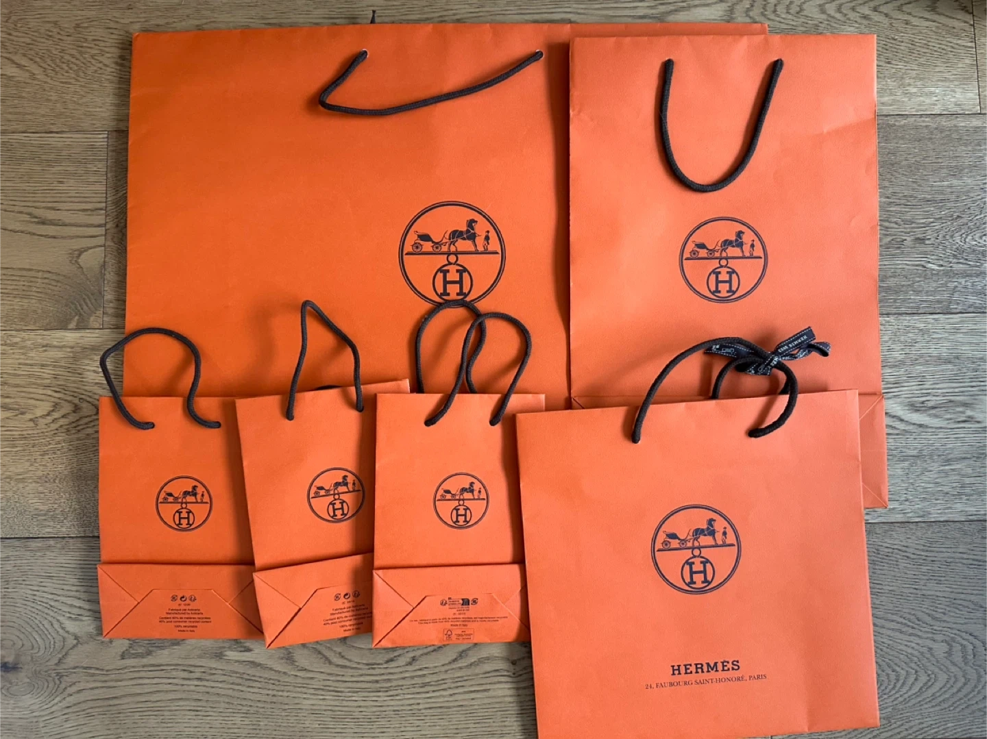 36Assorted Hermes paper bags Open to offers Mini - 9” by 6” - $10/each Square - 12” by 12” - $15 Rectangle - 17” by 11” - $15 Extra Large - 19.5” by 23.5” - $20
