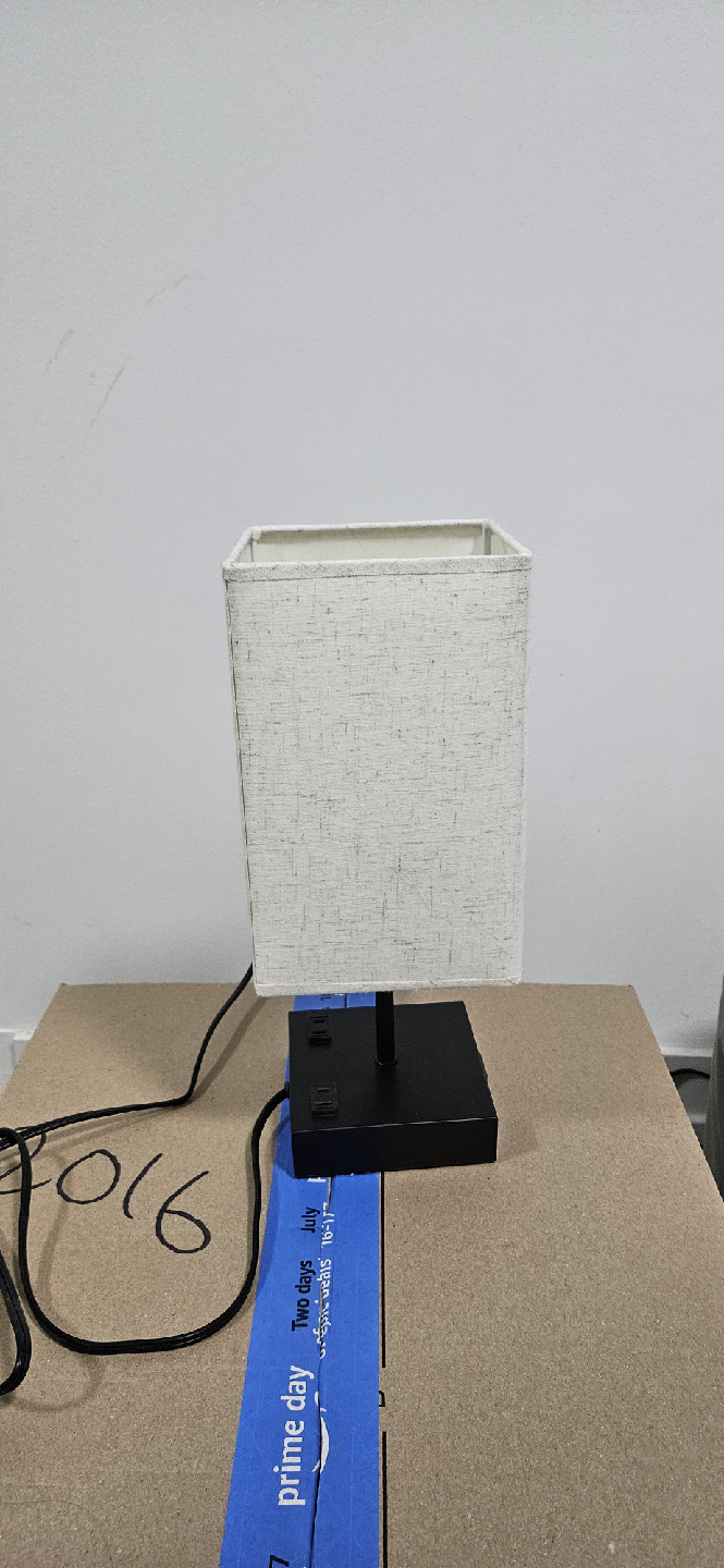 This is a cute square table lamp with a black base and a light beige shade. It also has USB ports built into the base, which is super handy.