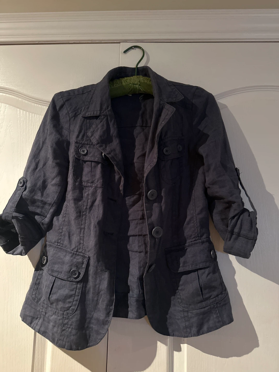 A stylish blue linen blend jacket, perfect for layering! It features a button-up front and practical pockets. This jacket is in great condition and ready for a new home