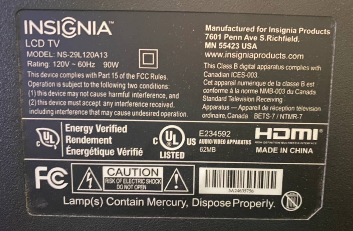 47Selling an Insignia 29-inch LCD TV. The model number is NS-29L120A13. It comes with a remote control, model number NS-RC03A-13. It has various input/output ports including HDMI, USB, and component video.