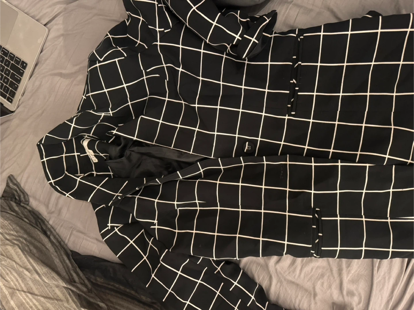 10Selling a blazer with a black and white grid pattern. It's in great condition and would be a stylish addition to your wardrobe!