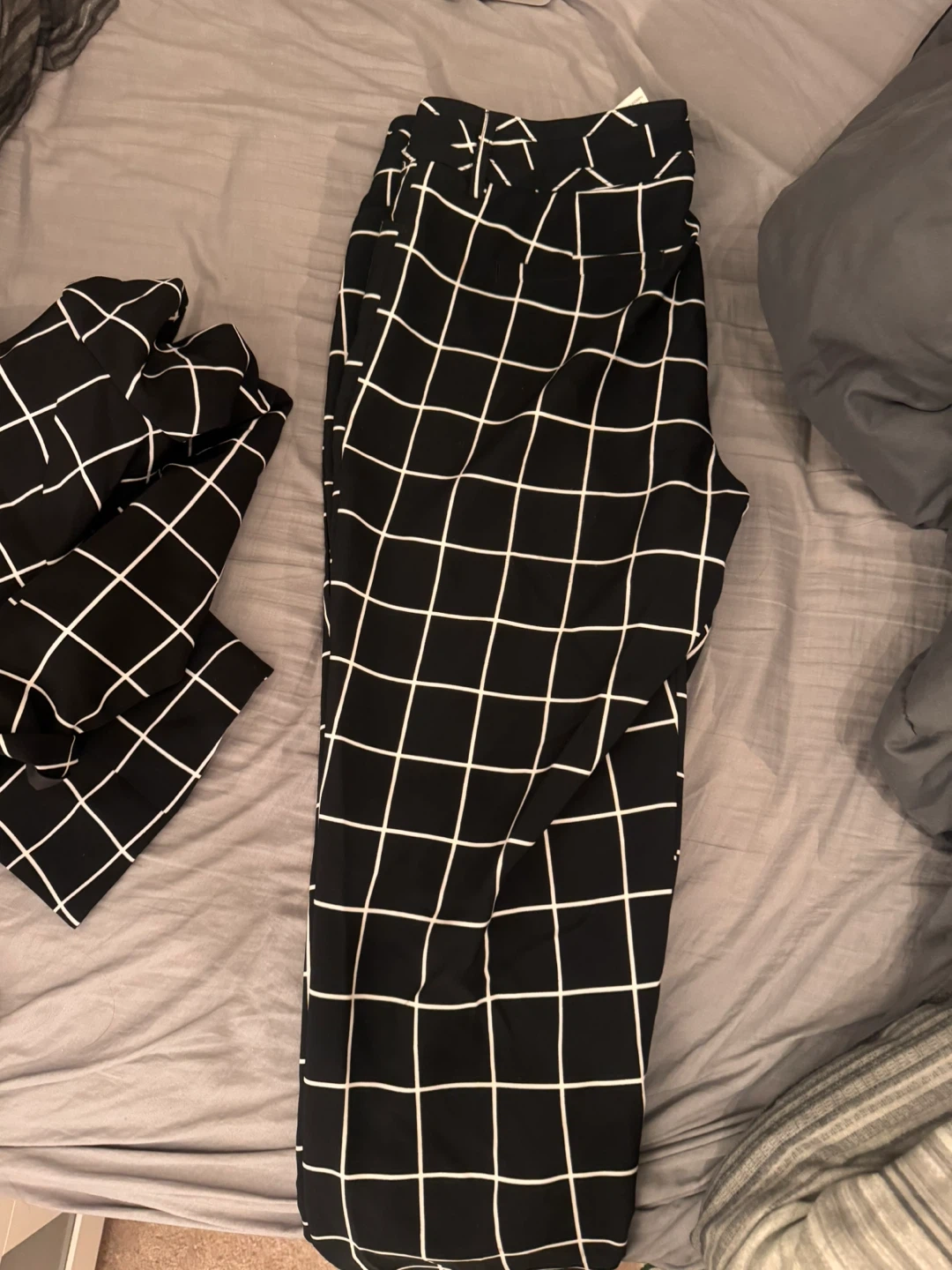 10Selling these stylish black pants with a white grid pattern! They're in great condition and ready for a new home. Perfect for adding a trendy touch to your wardrobe