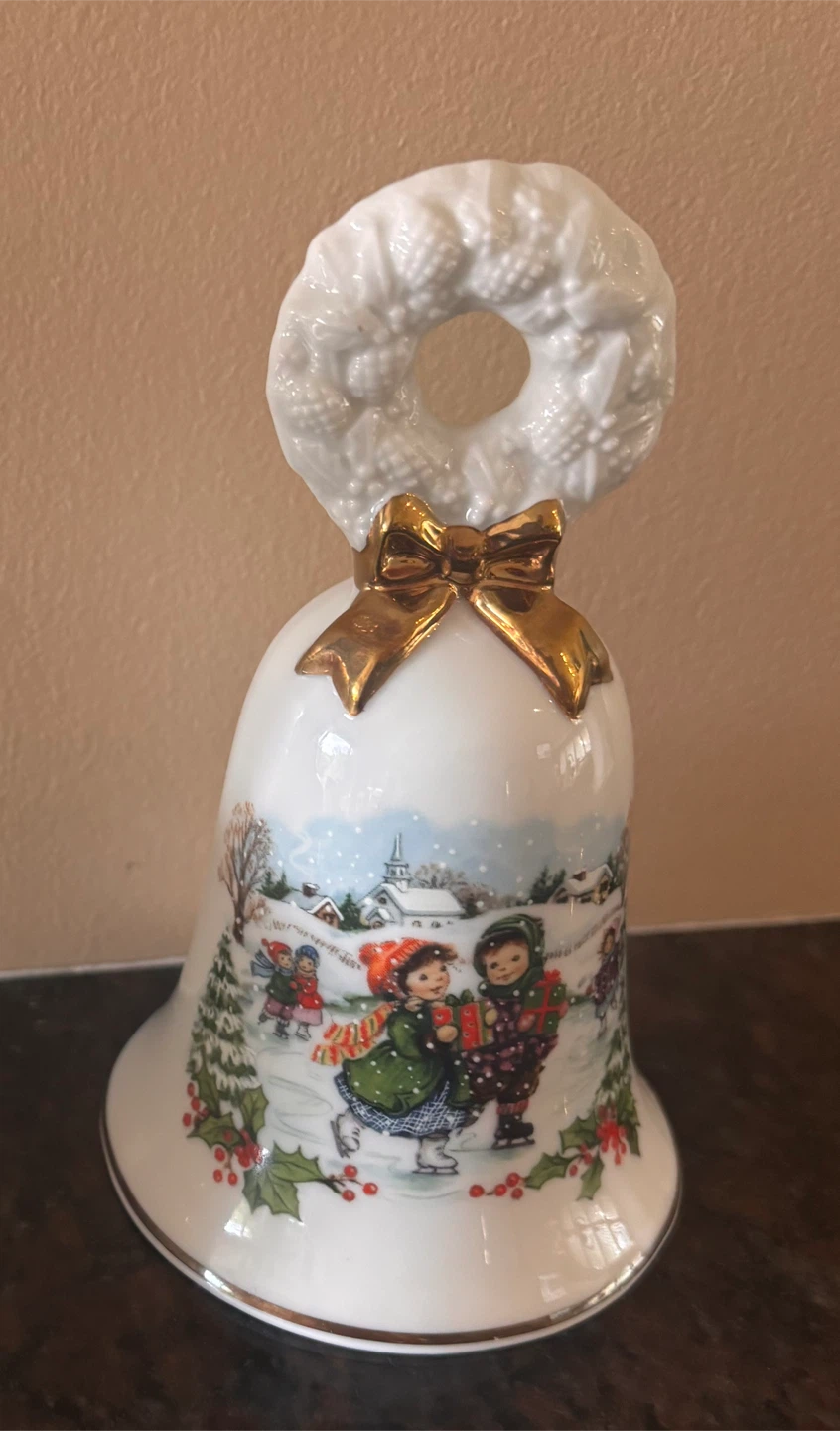 Summon your holiday guests to dinner in style with this vintage bell. Perfect like new condition. Made in 1986, has a winter scene with children skating, a wreath handle, gold bow & trim.