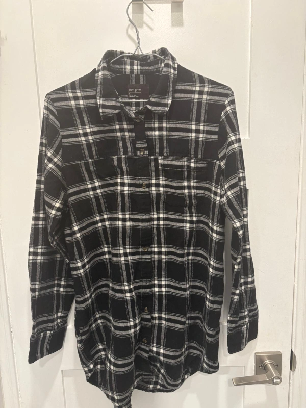 623Cozy up in this Free Press flannel! It's a classic black and white plaid pattern, perfect for layering or wearing on its own. It's a size small and in great condition. A comfy addition to any wardrobe