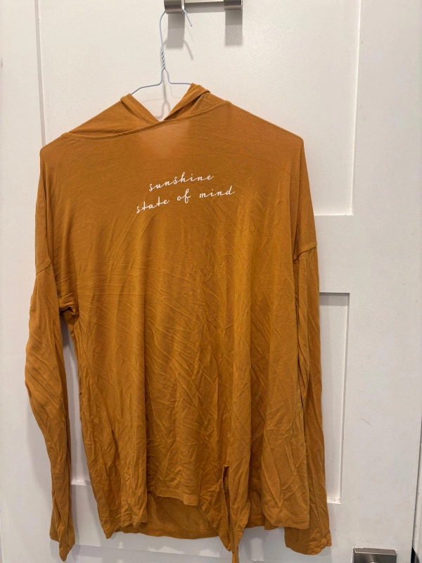 623A cute long sleeve top in a mustard colour. It has a hood and says 'sunshine state of mind' on the front. Perfect for layering or wearing on its own!