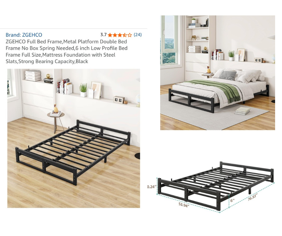 Selling a ZGEHCO full bed frame. It's a black metal platform double bed frame that doesn't need a box spring. It has a 6-inch low profile and is made with steel slats for strong bearing capacity.