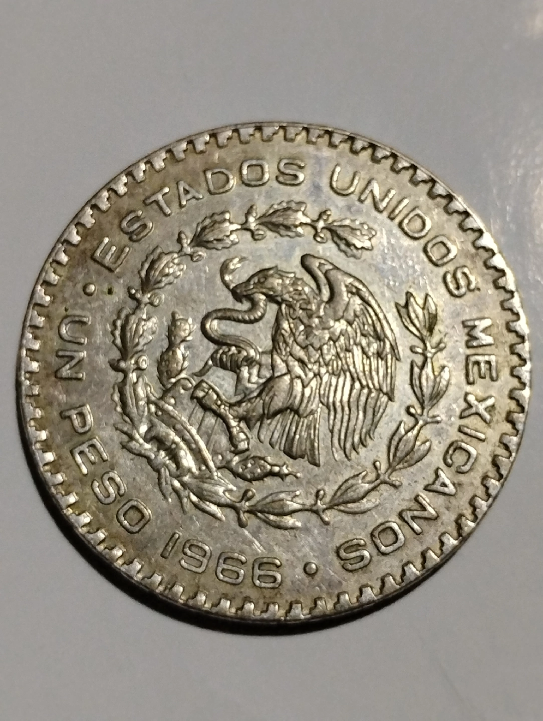 290Selling a vintage Mexican silver peso coin from 1966. It features the Mexican coat of arms on one side and a portrait on the other. A great piece for collectors!