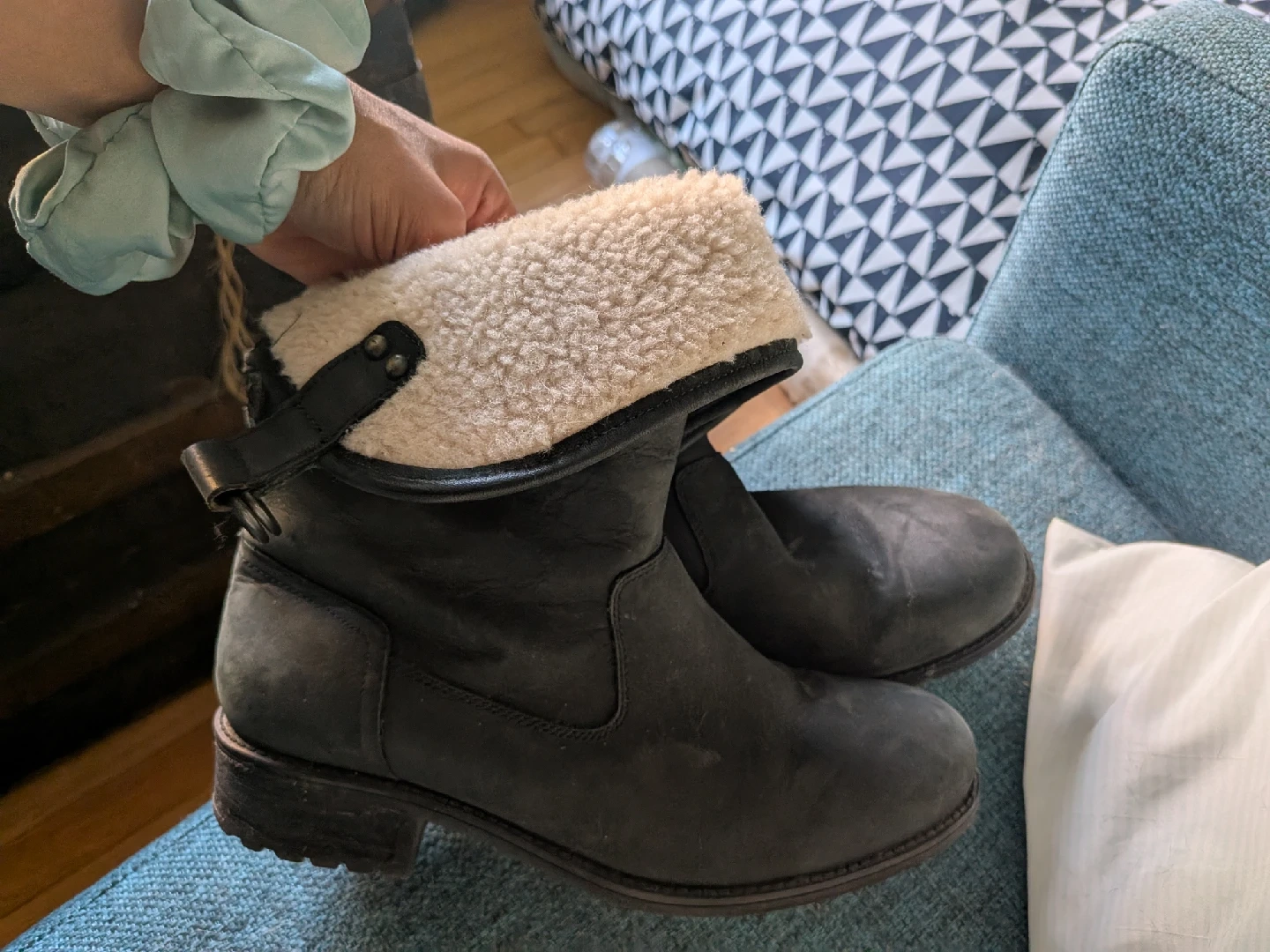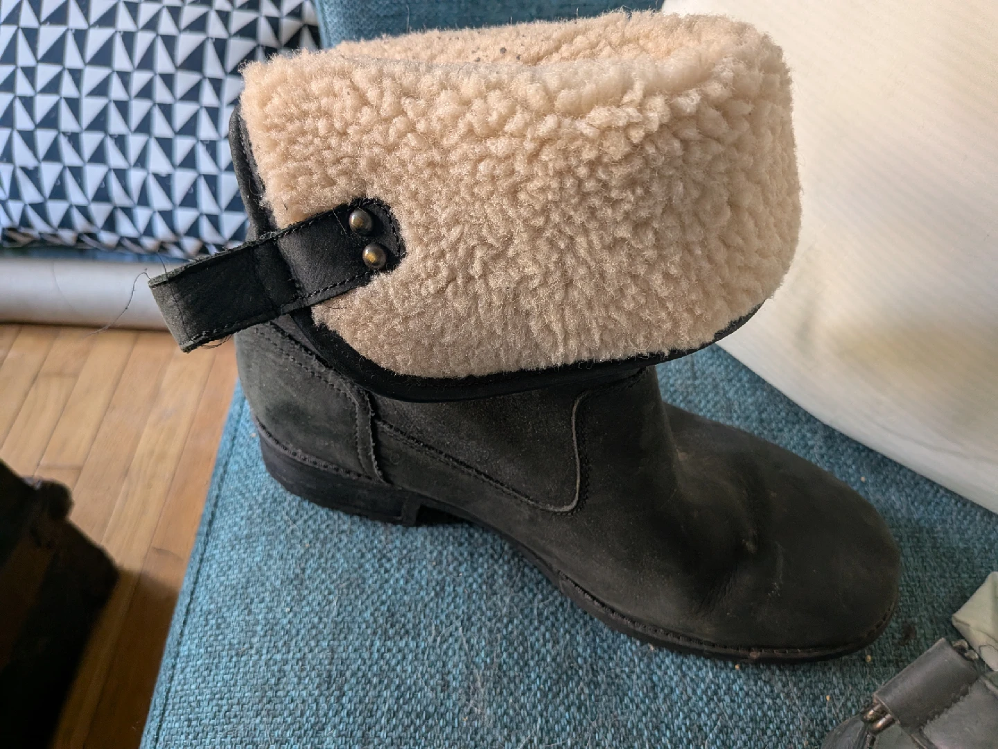 Cozy UGG boots up for grabs! These are black leather boots with a plush shearling lining. They're marked as a women's size 10 (US). Perfect for keeping your feet warm and stylish during the colder months!