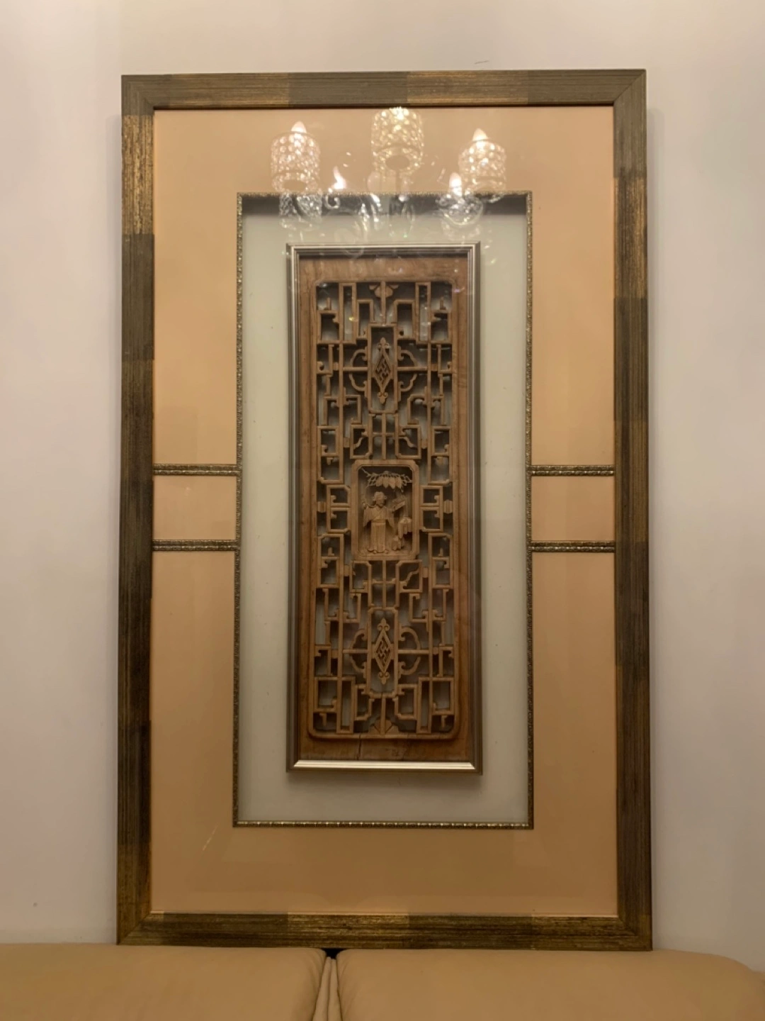 68Beautiful framed wall art featuring an intricately carved wooden panel. The frame has a lovely gold finish and the piece would add a touch of elegance to any room. It's in great condition!