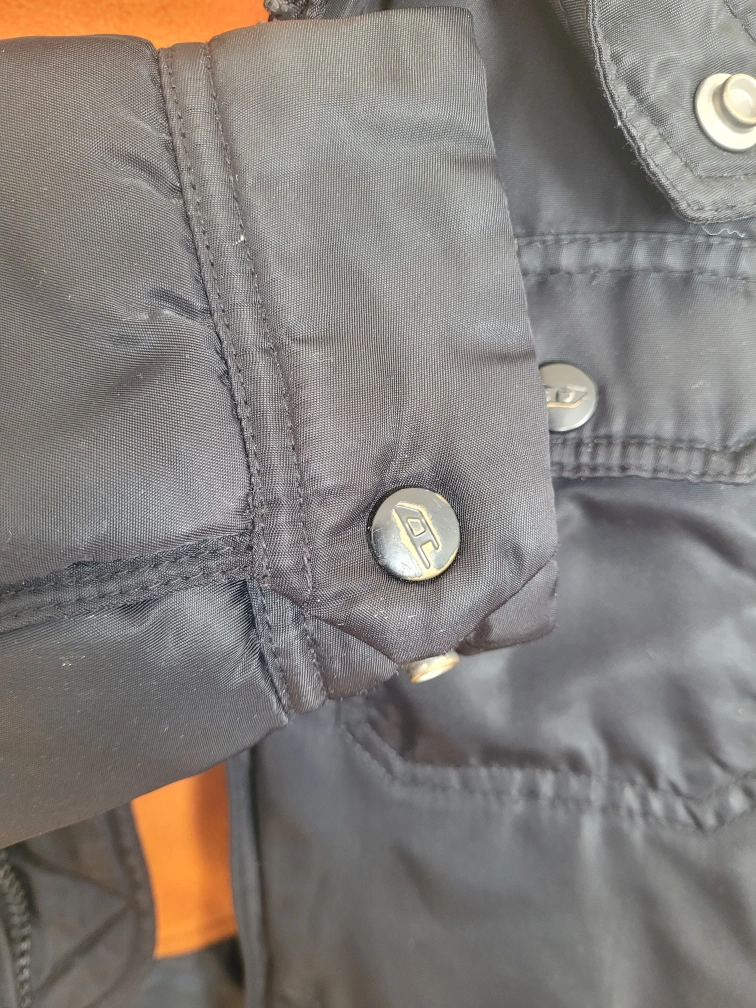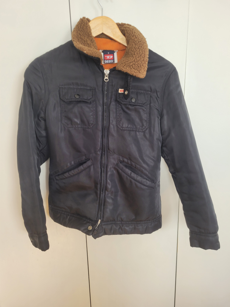 Diesel jacket in black with a cozy sherpa collar! It has a stylish and functional design, perfect for cooler weather. The jacket features a durable outer material and a warm inner lining to keep you comfortable. It's in great condition and ready for a new home!