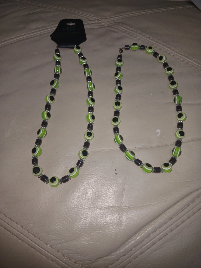 38Two beaded necklaces for sale! One is slightly longer than the other. They feature green, black, and white beads with silver accents. Perfect for adding a pop of colour to your outfit!