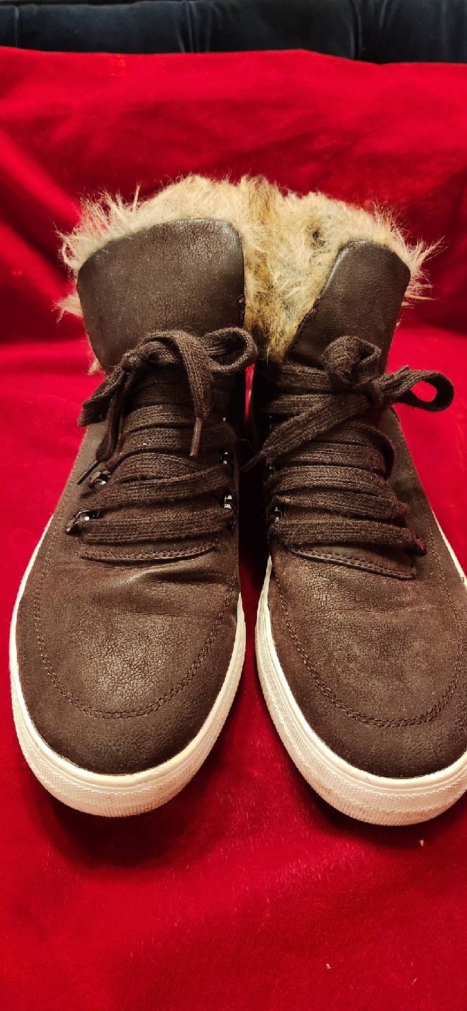 Selling a pair of brown high top sneakers with fur lining! They're a size 10 and in good condition. Perfect for adding a bit of cozy style to your outfit!