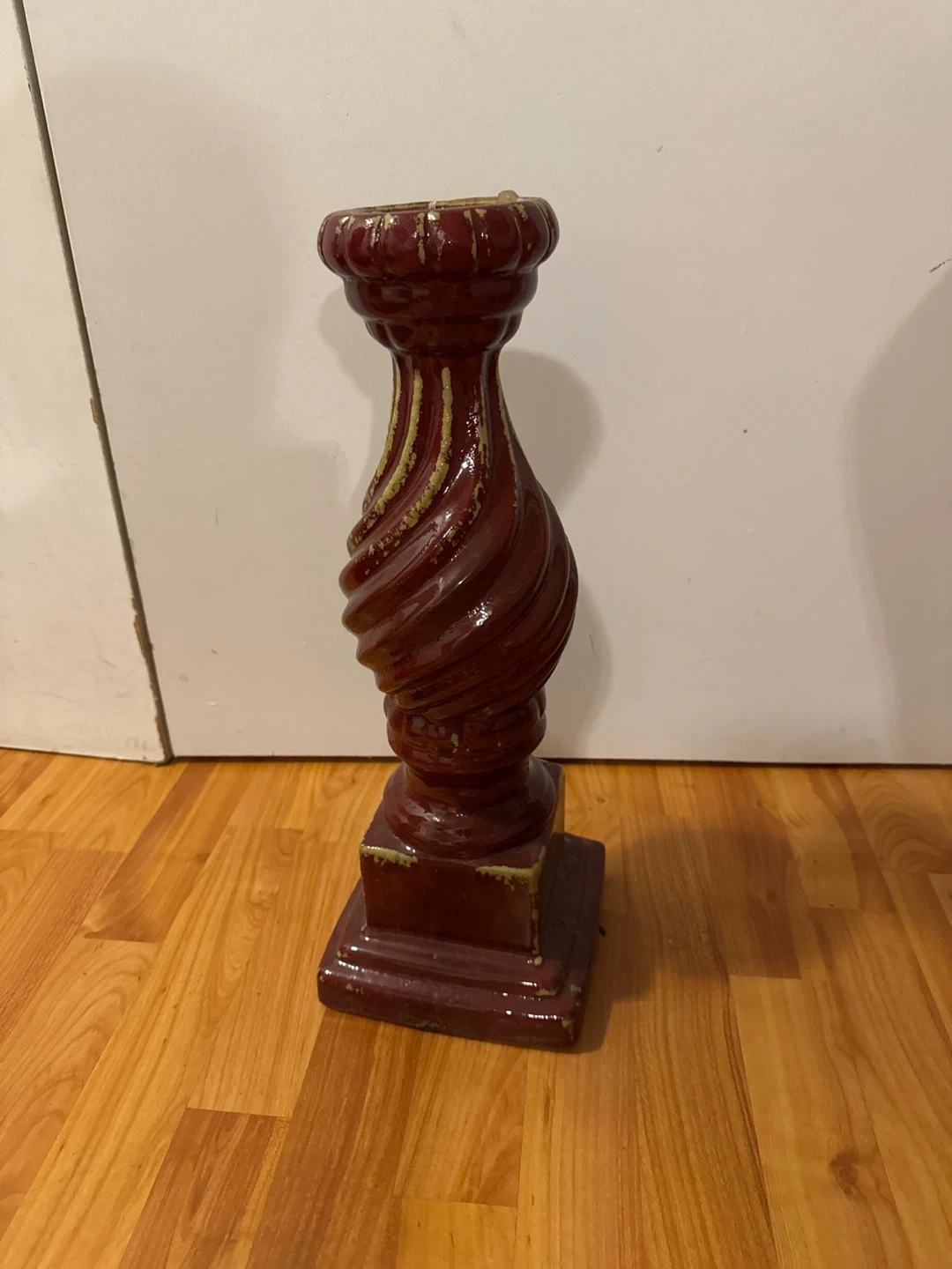 27Selling a decorative pillar candle holder. It's a burgundy colour with a unique twisted design. It would look great in any room!