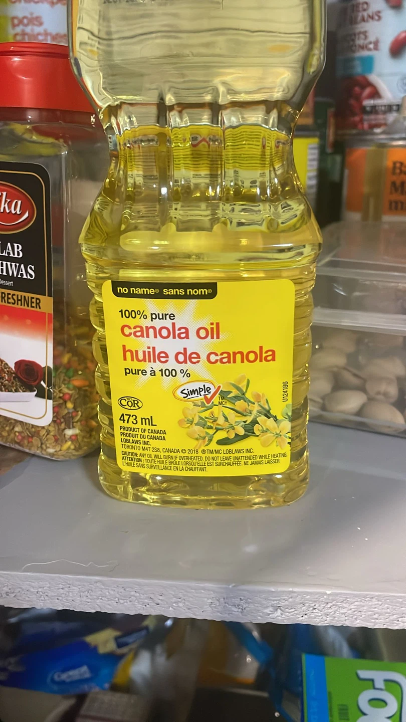 Selling a bottle of No Name 100% pure canola oil. It's a 473 mL bottle, perfect for all your cooking needs! Product of Canada.