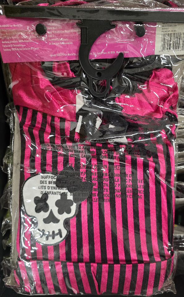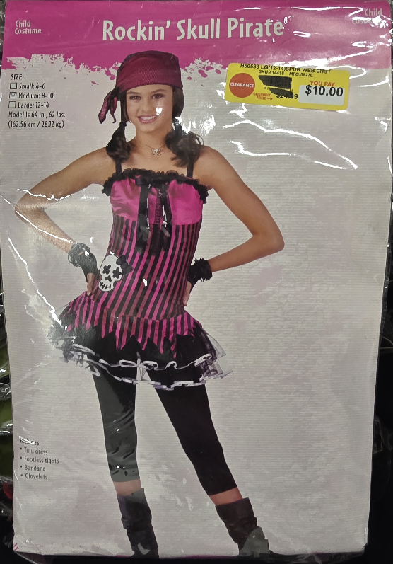 Get ready for Halloween with this Rockin' Skull Pirate costume! It's a size Large (12-14) and includes a tutu dress, footless tights, bandana, and glovelets. The costume features a fun skull design and is perfect for any young pirate enthusiast