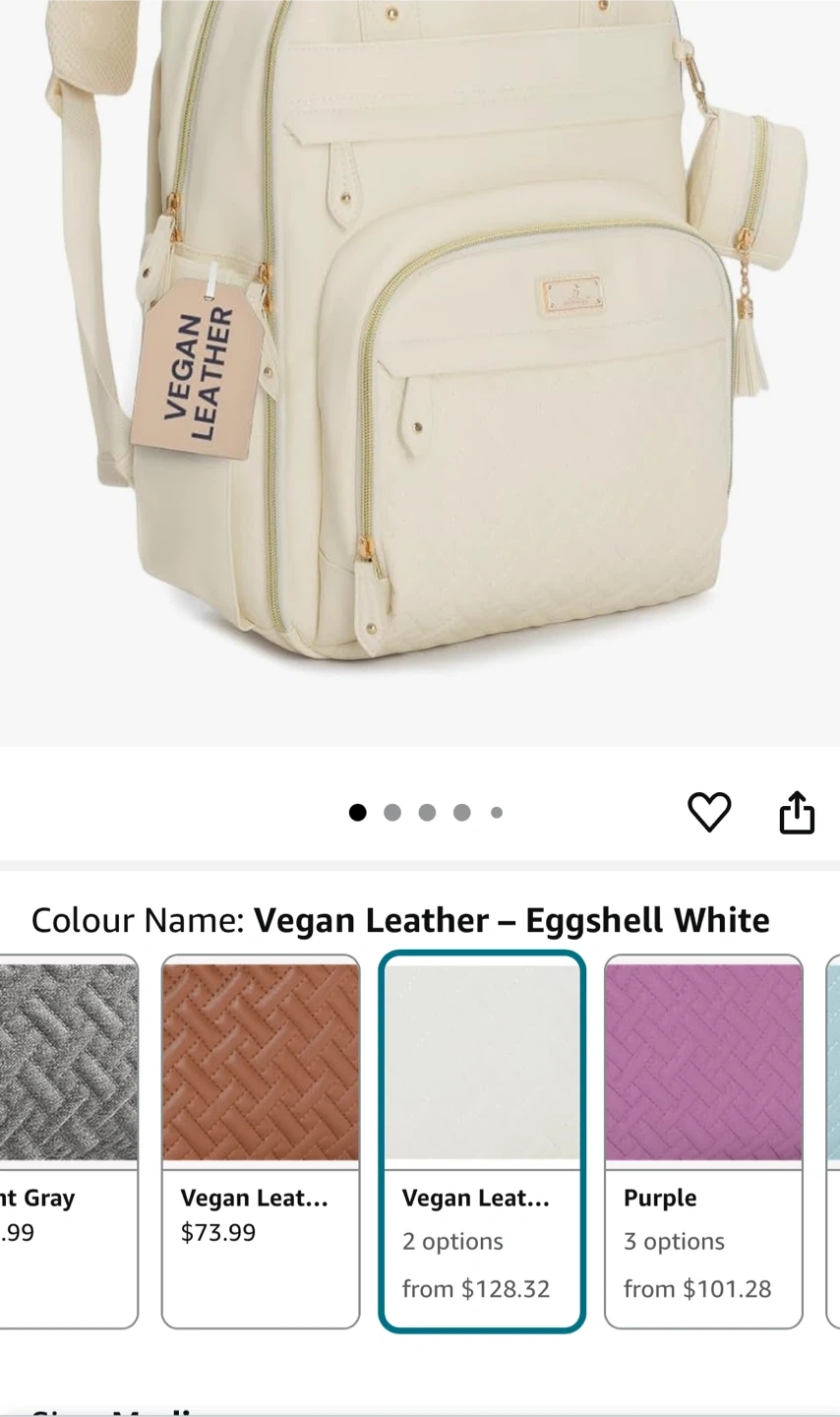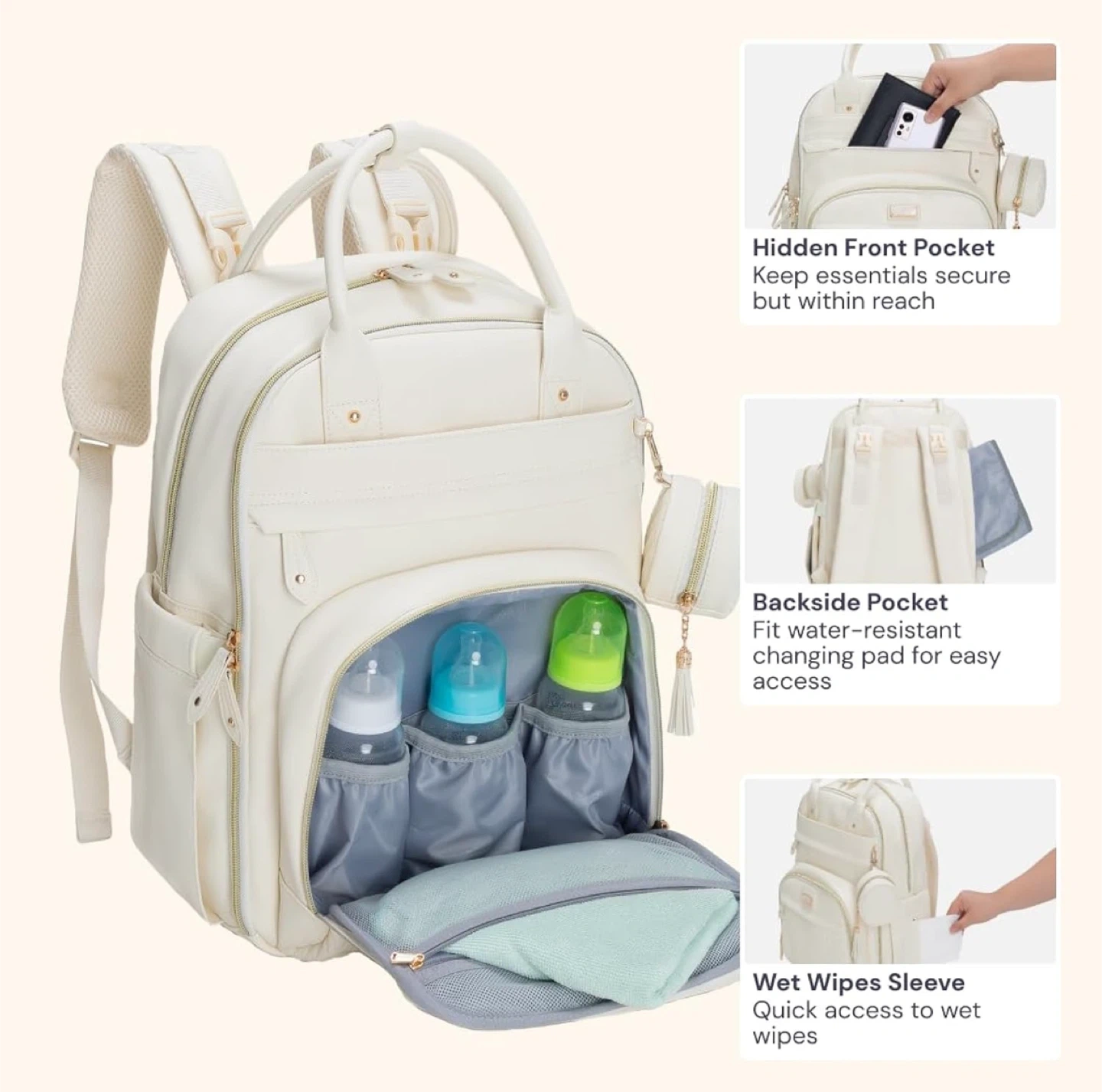 This eggshell white diaper backpack is made of vegan leather! It's got a large capacity with 17 pockets to store everything, including insulated bottle pockets.