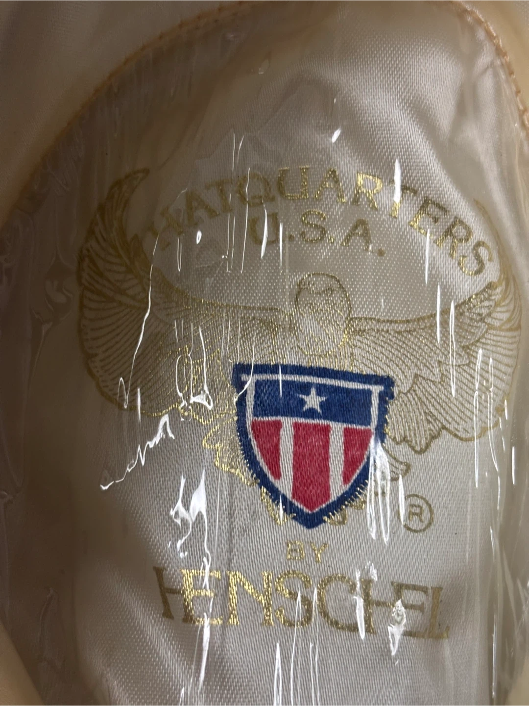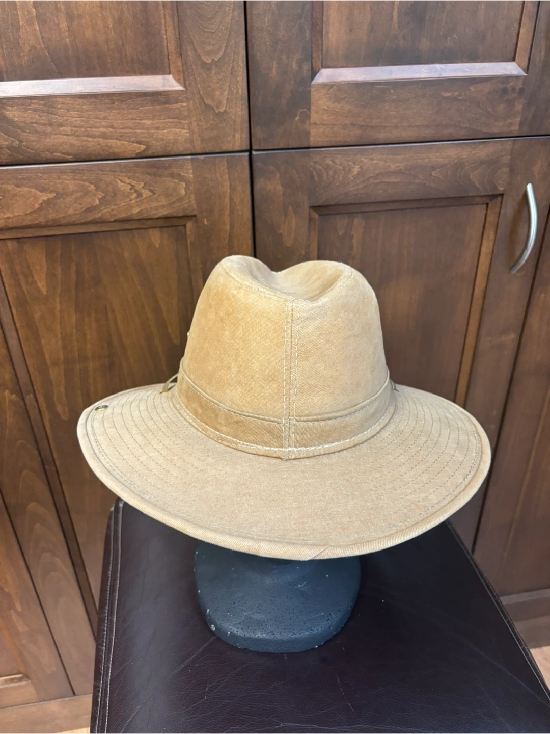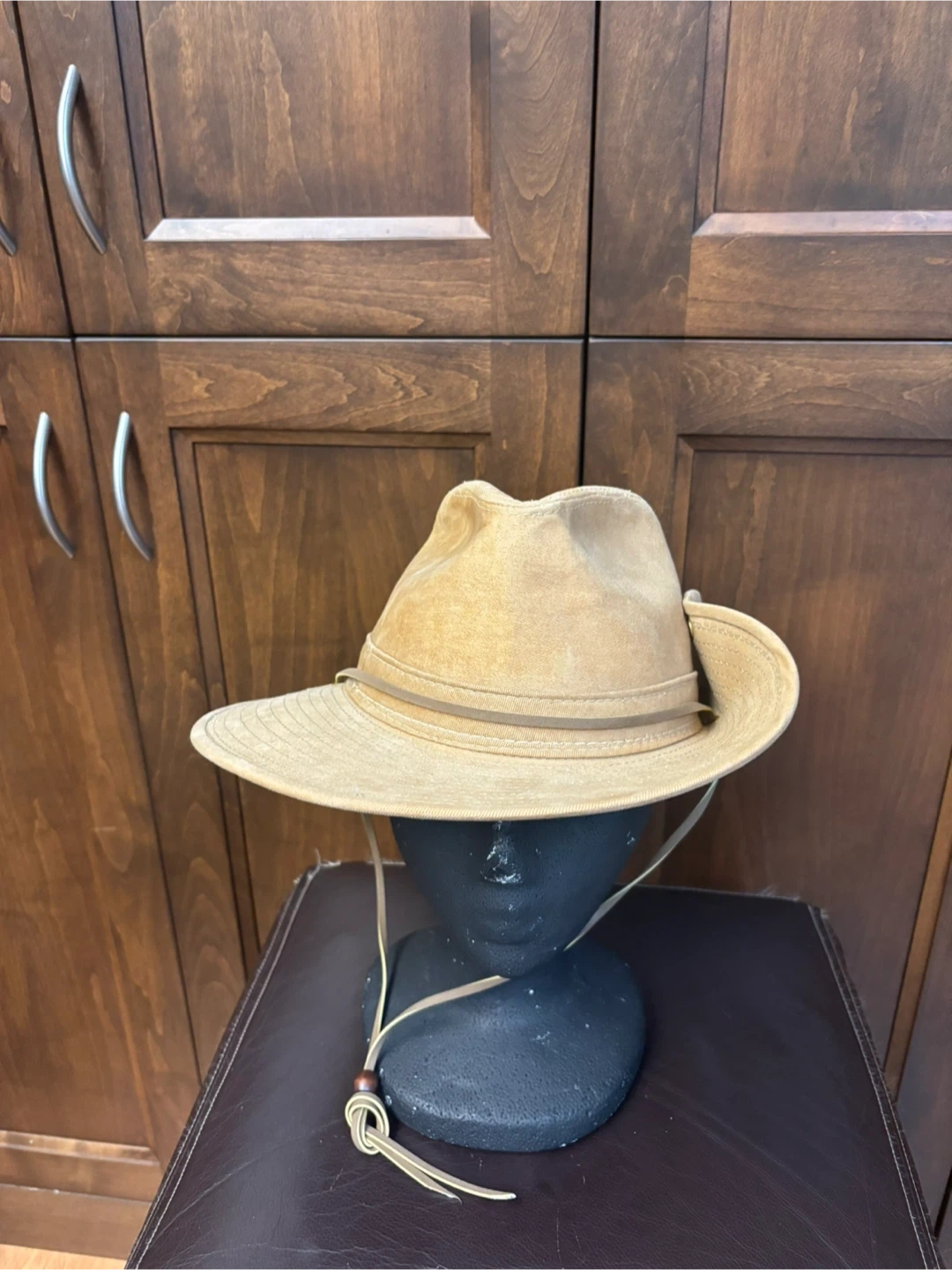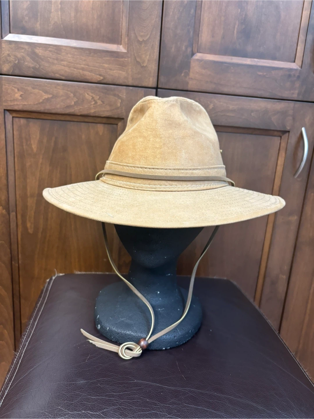 60Selling mens medium hat in great condition! It's a stylish and comfortable hat, perfect for adding a touch of class to any outfit. The hat is a beautiful tan colour and has a classic design. Leather and wood draw string chin strap and brass hardware.