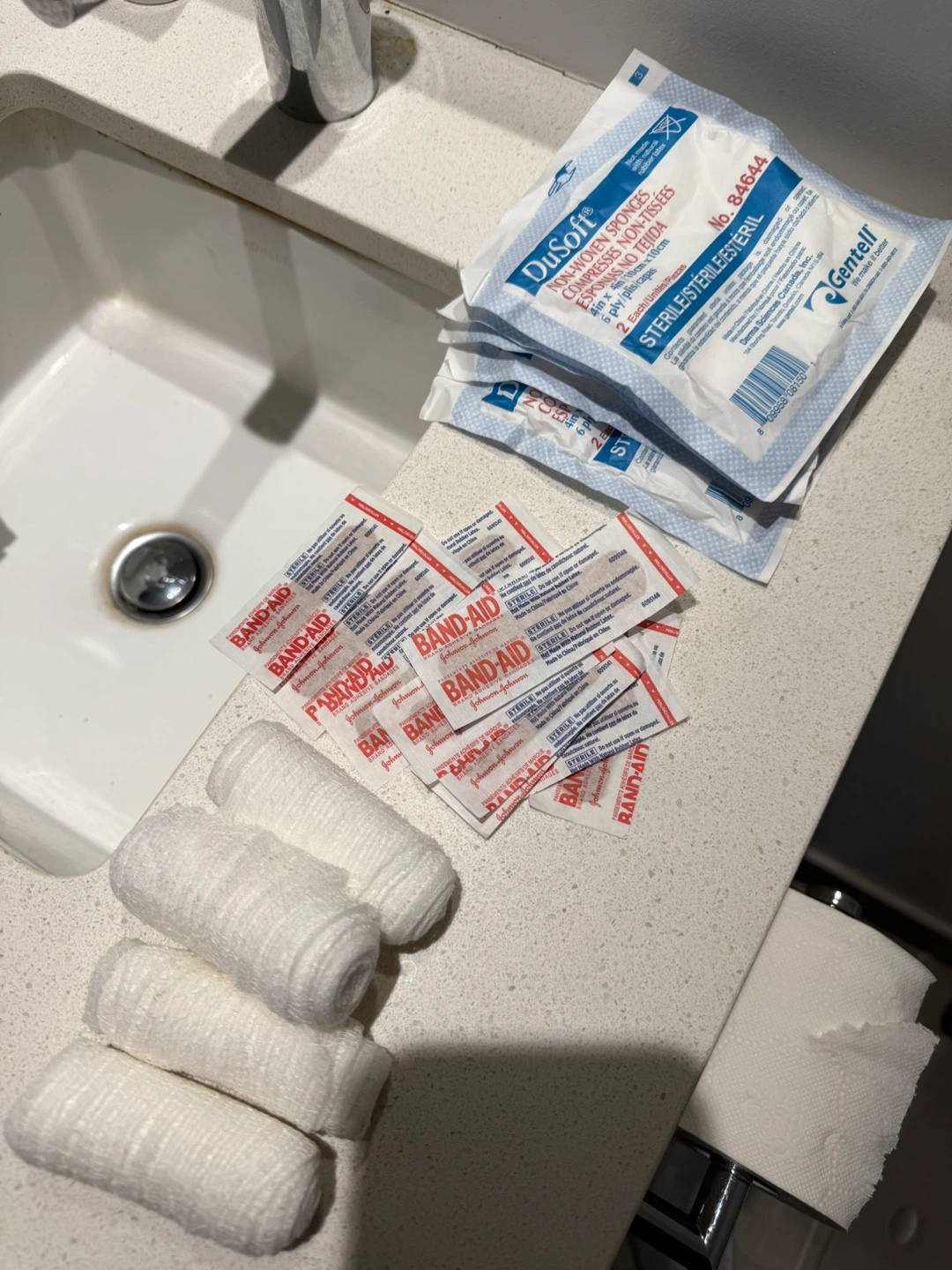 Selling a mix of Band-Aid brand adhesive bandages and DuSoft non-woven sponges. The Band-Aids are individually wrapped and sterile. The DuSoft sponges are 4in x 4in, 6-ply, and come in packs of two. Perfect for your first aid needs! 12 band-Aids, 4 gauze, 5 sterile non woven sponges.
