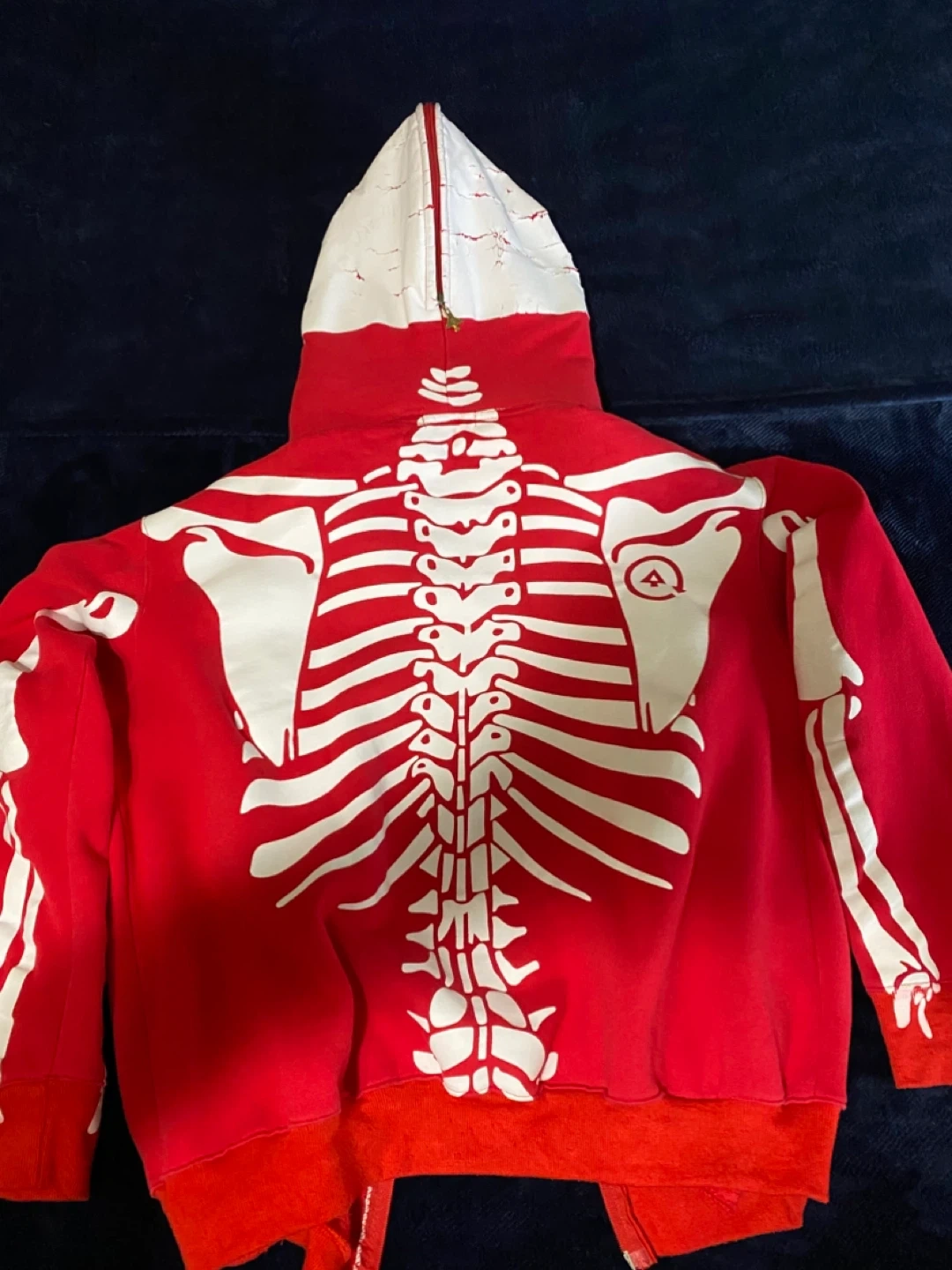 Selling a Dead Serious red full zip-up hoodie with a skeleton design from LRG. It's a unique piece with an anatomically correct skeleton print on both the front and back. This hoodie also features mesh eye holes and glittery gold teeth making it a standout item for anyone's wardrobe! Perfect for spooky season! Condition of the body is good, head/skull is okay. It's seen better days but ironically has life in it yet! Get it ..? Nevermind ... Open to offers