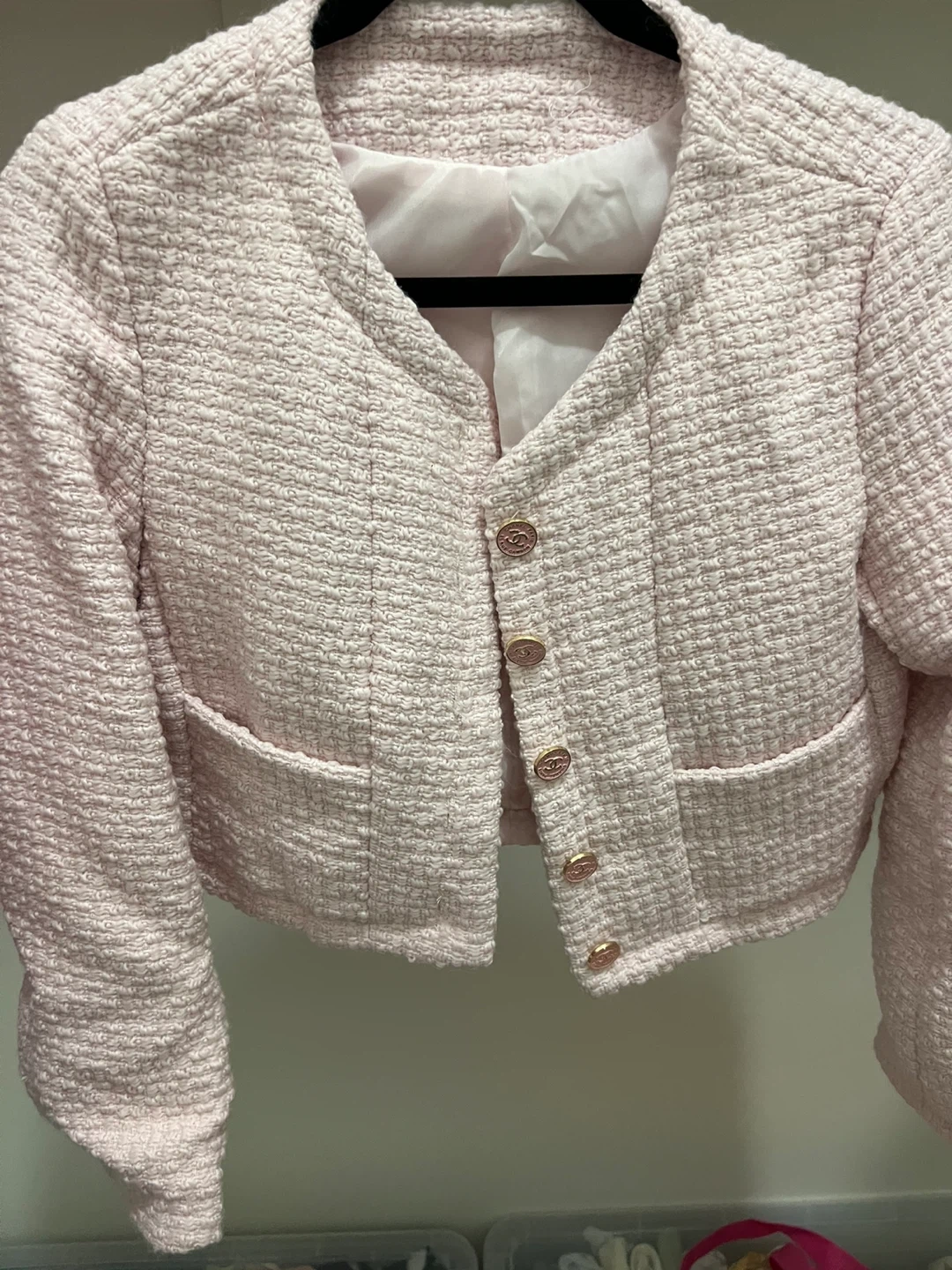 83Here's a lovely pink tweed jacket with Chanel logo buttons. It's in great condition and ready for a new home!
