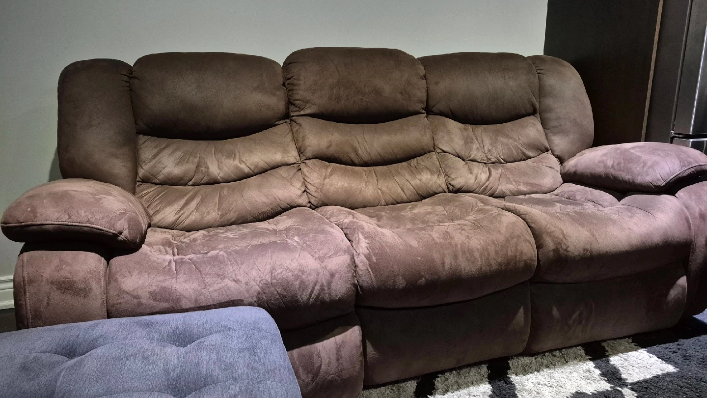 Selling a comfy brown reclining sofa! It's a great piece for any living room or den. It's still in good condition and ready for a new home. One of the springs is missing so the recliner gets softly ejected sometimes. Easily rectifiable. Upgrading, so selling this one. Comes with a few spares.