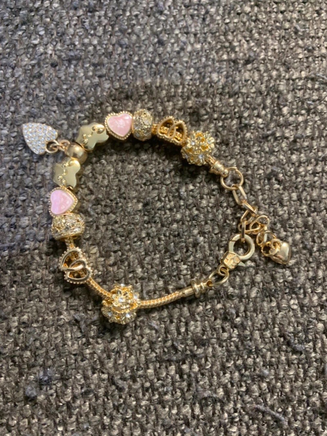 1000+Selling a cute gold charm bracelet! It features a variety of charms, including hearts, crowns, and jeweled beads. It's in great condition and ready for a new home