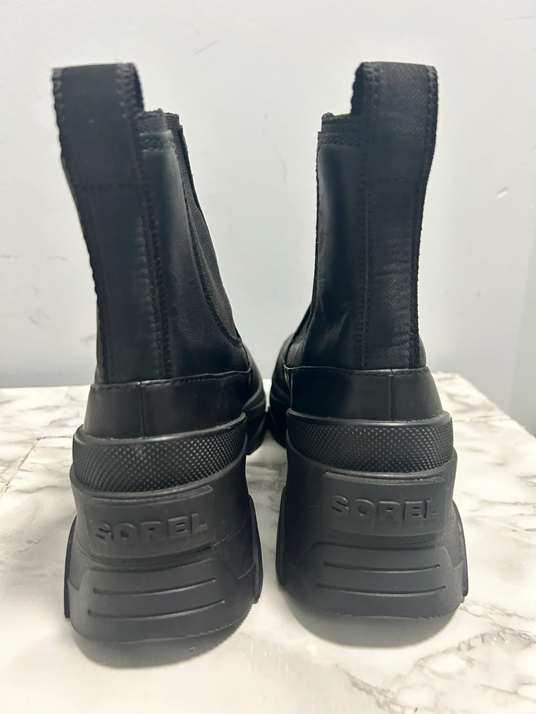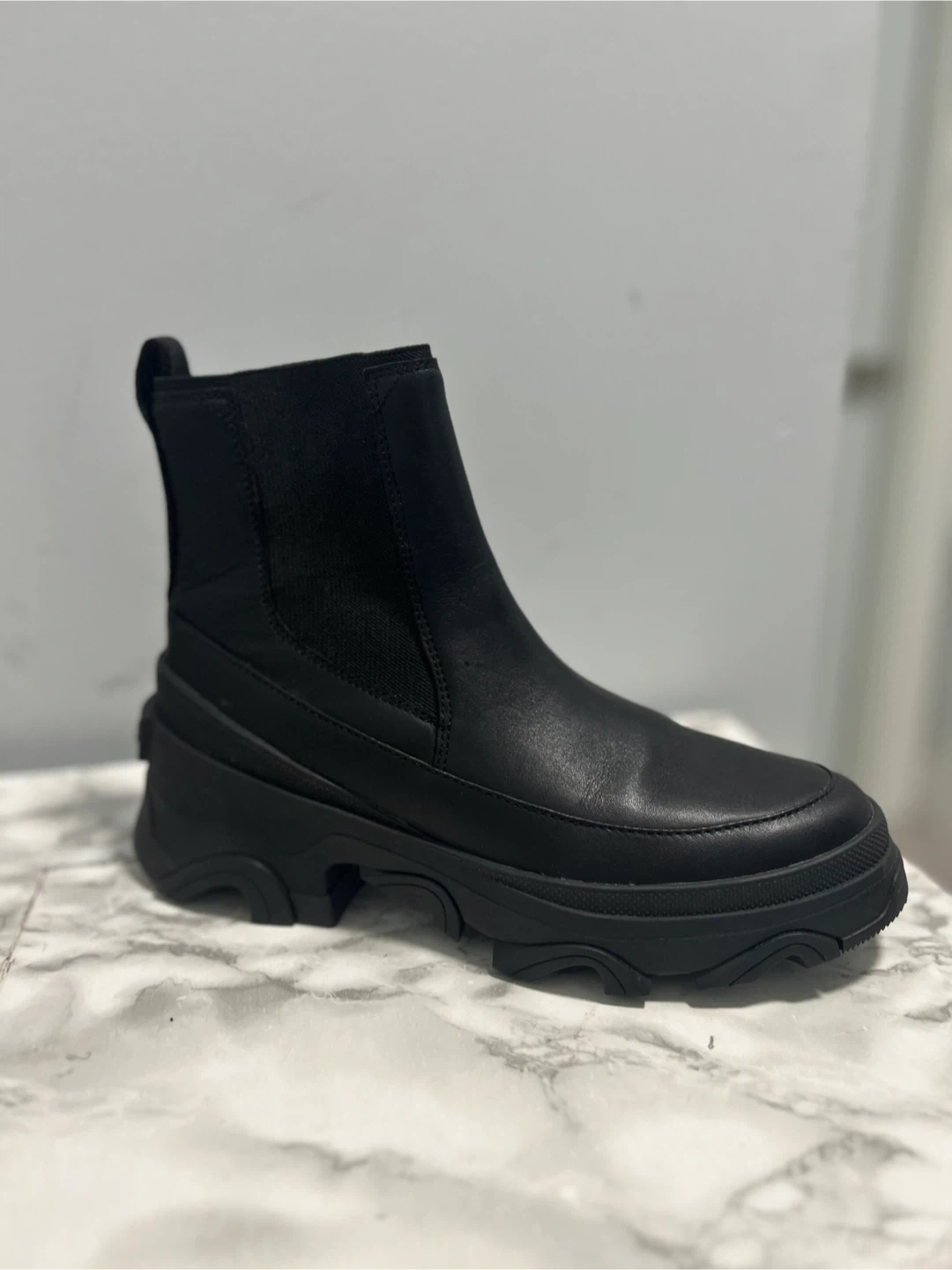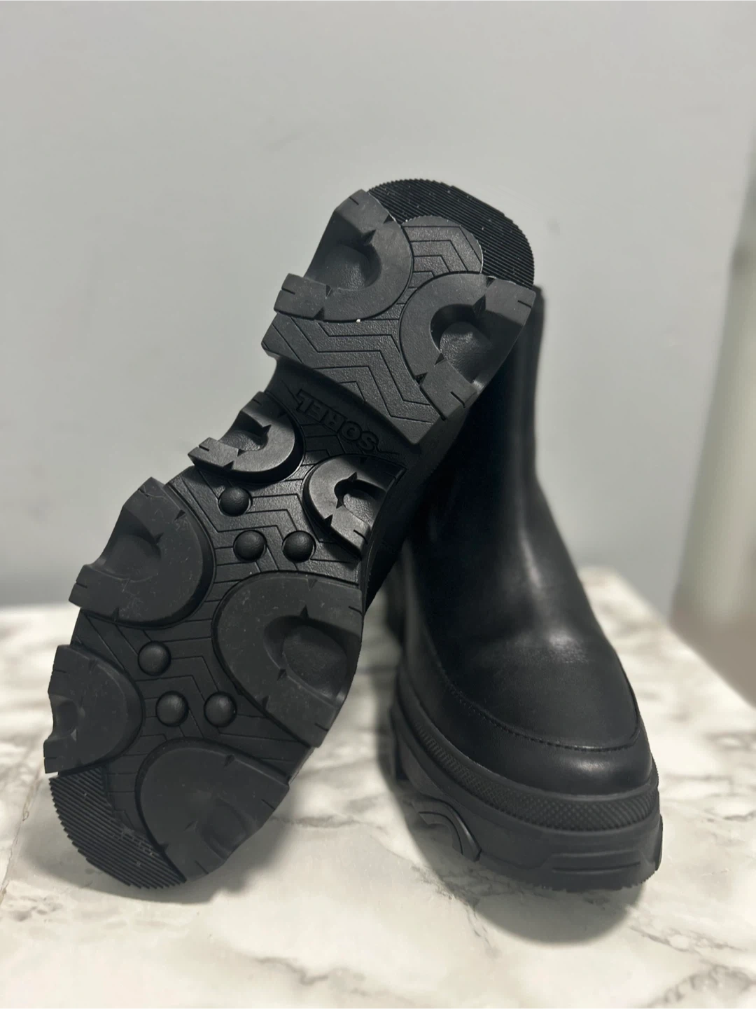 Selling a pair of Sorel Chelsea boots in black leather. These boots are in great condition and ready for a new home! They have a stylish and practical design, perfect for everyday wear. The soles are durable and provide good traction.