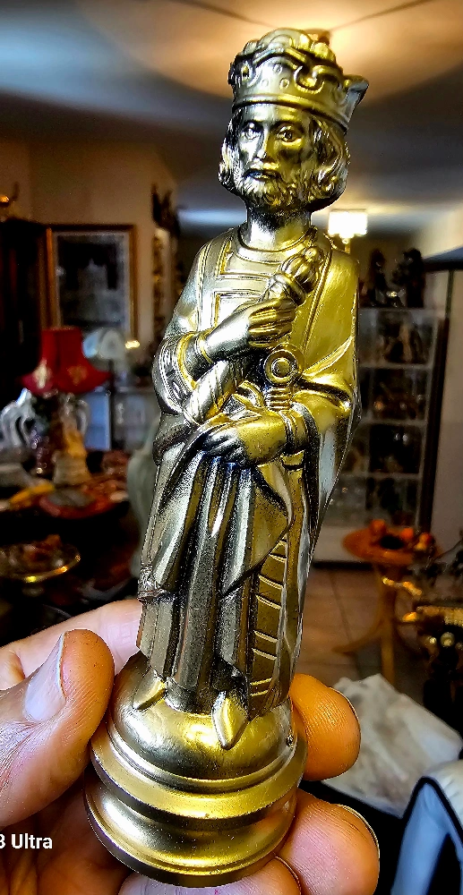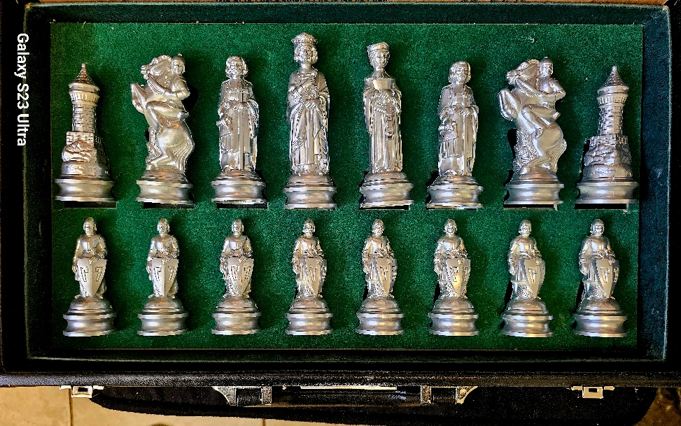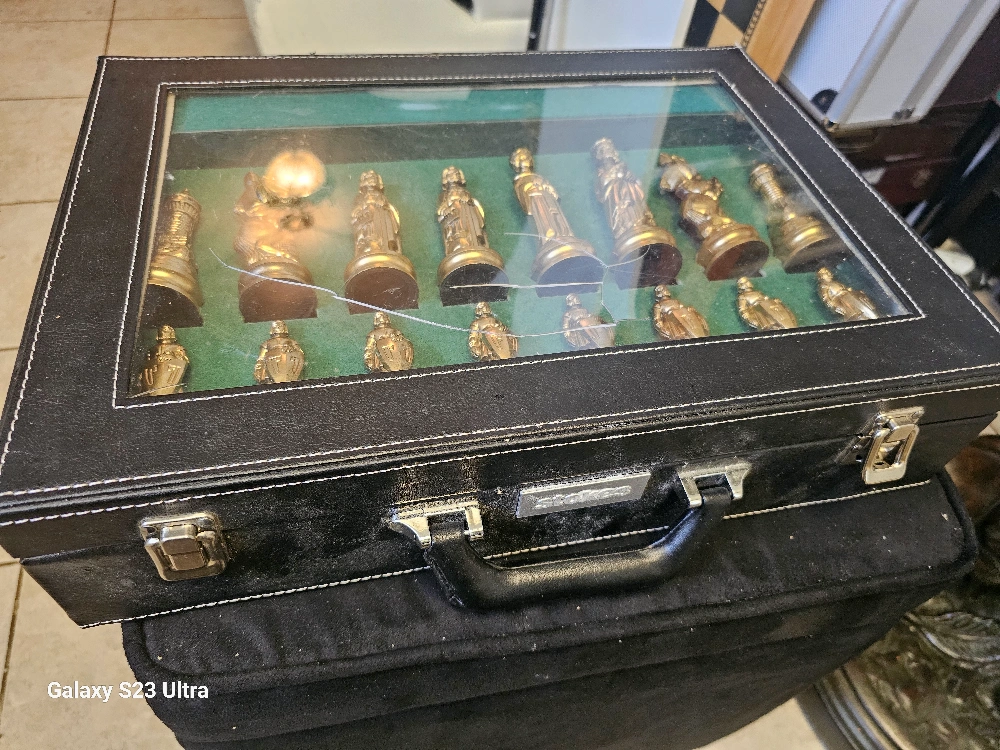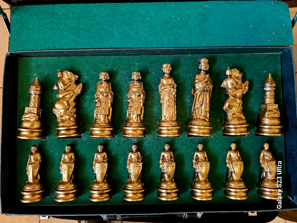 Selling a beautiful vintage chess set! The pieces are a mix of pewter and gold colours, giving it a unique and classic look. It comes with its original leather show case, perfect for storage and display. A great addition for any chess enthusiast or collector!