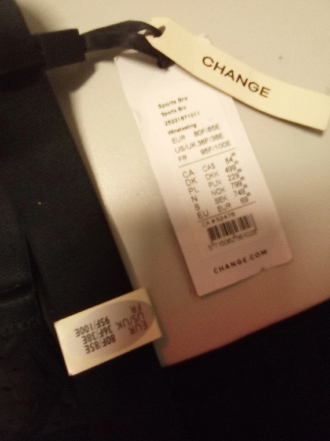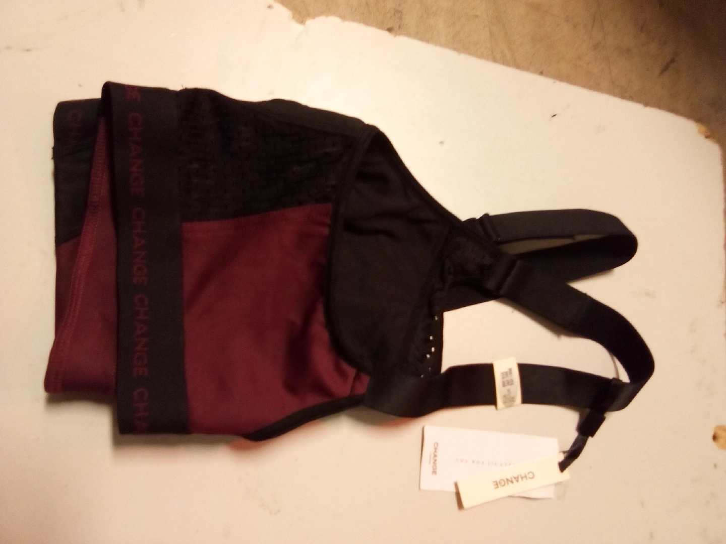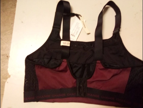 10This is a brand new CHANGE sports bra, size 80F/36E. It's a stylish black and burgundy colour. It has the original tags attached, showing it originally retailed for EUR 89. Super comfy and supportive!