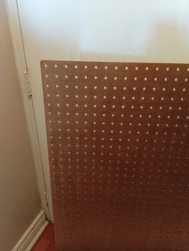 This is a used pegboard, perfect for organizing your space or displaying items. It is in fair condition, showing some signs of wear, but it's fully functional and ready for your projects. This pegboard measures approximately 30 x 47.5 Finding a use for it is up to you, which is the fun part! If the ad is up, it's available!