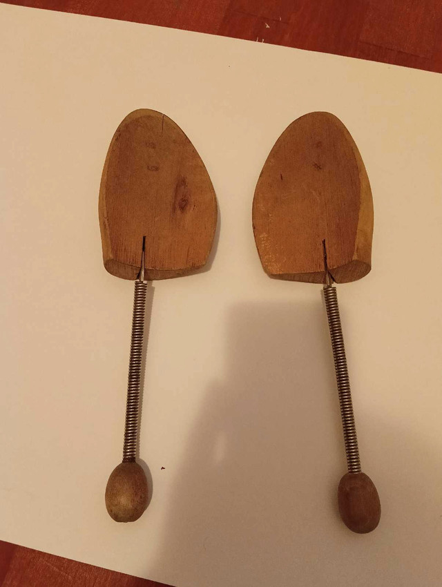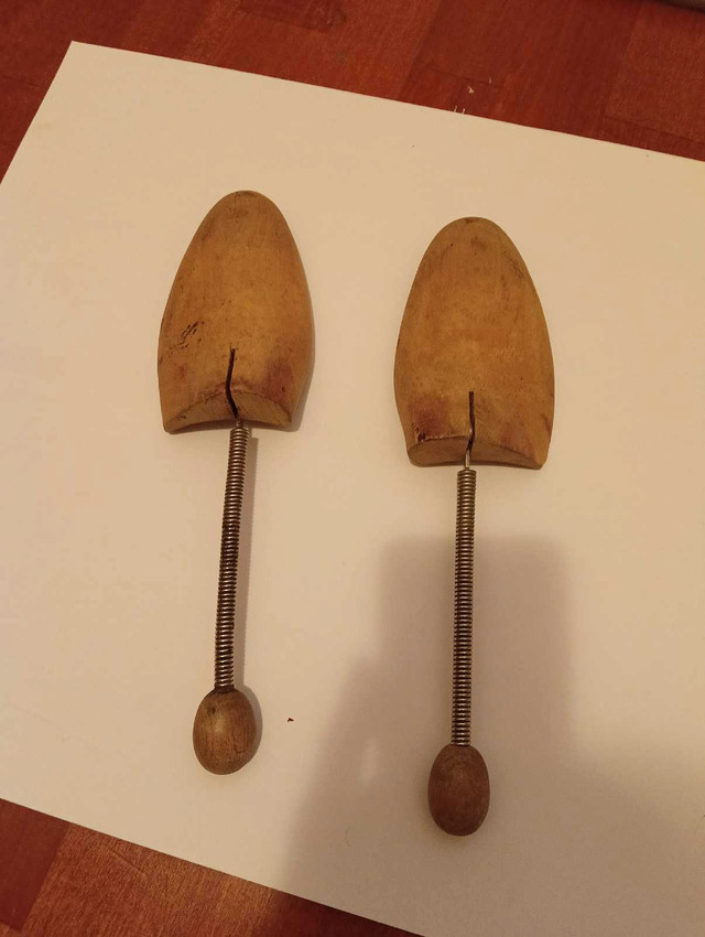 These are shoe trees, used to keep your shoes in tip-top shape and prevent creasing. They're made of wood and have a spring-loaded mechanism to fit various shoe sizes. As you can see in the images, these have been previously enjoyed, which only adds to their vintage charm. I am selling these to clear out some space. If the ad is up, the shoe trees are available.
