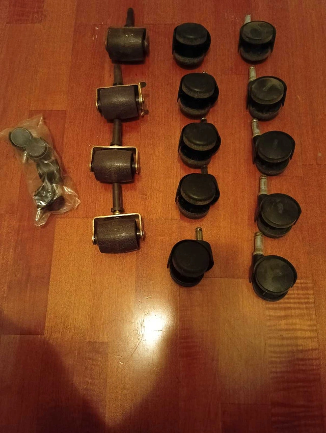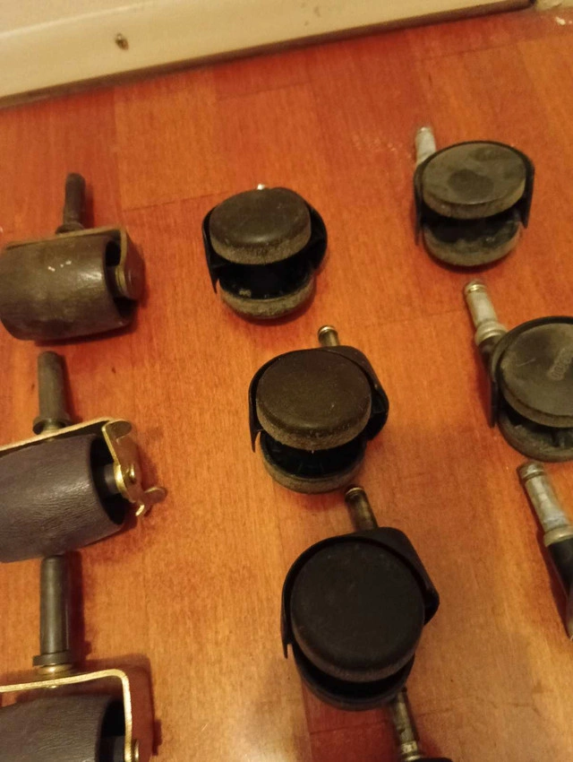 Got a collection of chair casters in varying conditions. Some are newer, some show their age with a bit of rust, but all are ready to roll. Perfect if you're looking to replace some worn-out wheels or want to add some mobility to your furniture projects. Please examine photos carefully to assess condition before purchasing. But hey, if the ad's up, the casters are still up for grabs.