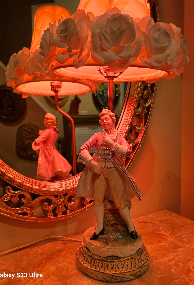 Check out this unique vintage lamp! It features a porcelain figurine base and a lovely rose-decorated lampshade. It's sure to add a touch of charm to any room.