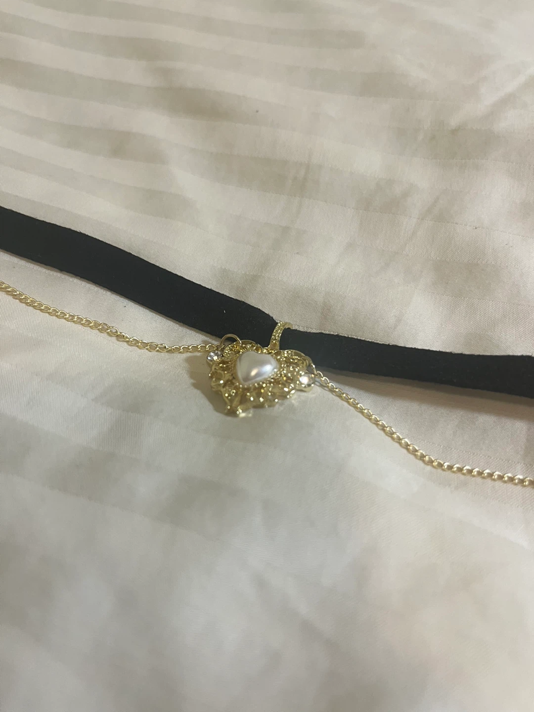Cute black velvet choker with a gold-tone heart pendant. The heart has a faux pearl in the centre and is surrounded by rhinestones. It has a lobster clasp closure and is in great condition!