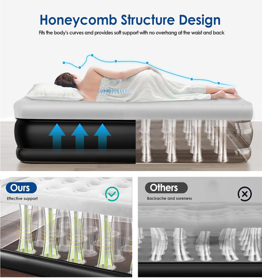 Selling a Moko Queen Air Mattress! It features an upgraded air chamber and a built-in pump for easy inflation. The honeycomb structure design provides support at the waist and back. It inflates in just 3 minutes!