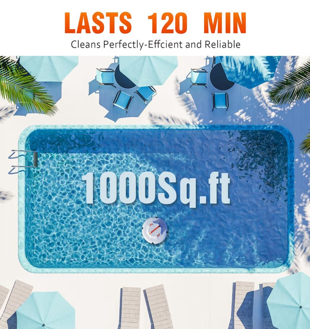 Keep your pool sparkling clean with this KOSGHO cordless robotic pool cleaner! It's designed for above-ground pools and can also be used in in-ground flat pools. It boasts a 120-minute runtime and can handle pools up to 1000 sq.ft. The cleaner features self-parking and dual-drive motors. It's efficient and reliable, making pool maintenance a breeze!