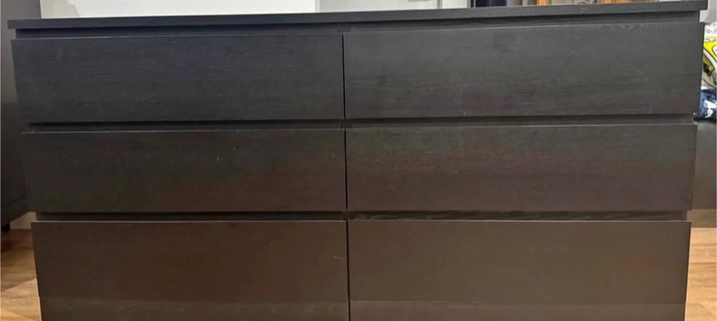 63Selling a gently used IKEA Hemnes dresser in black-brown. It's in great shape and ready for a new home! This spacious dresser offers lots of storage space for your clothes and accessories. Perfect for adding a touch of style to any bedroom It's ideal for any room thanks to its modern, minimalist, handle-free design. The drawers are spacious and slide smoothly. Color: Black-brown Number of drawers: 6 (very spacious) Condition: Used, like new. Dimensions: Width: 160 cm (63") Depth: 48 cm (19") no Height: 78 cm (30 3/4") We are selling it because we are redecorating. Pick up in Grousewoods.