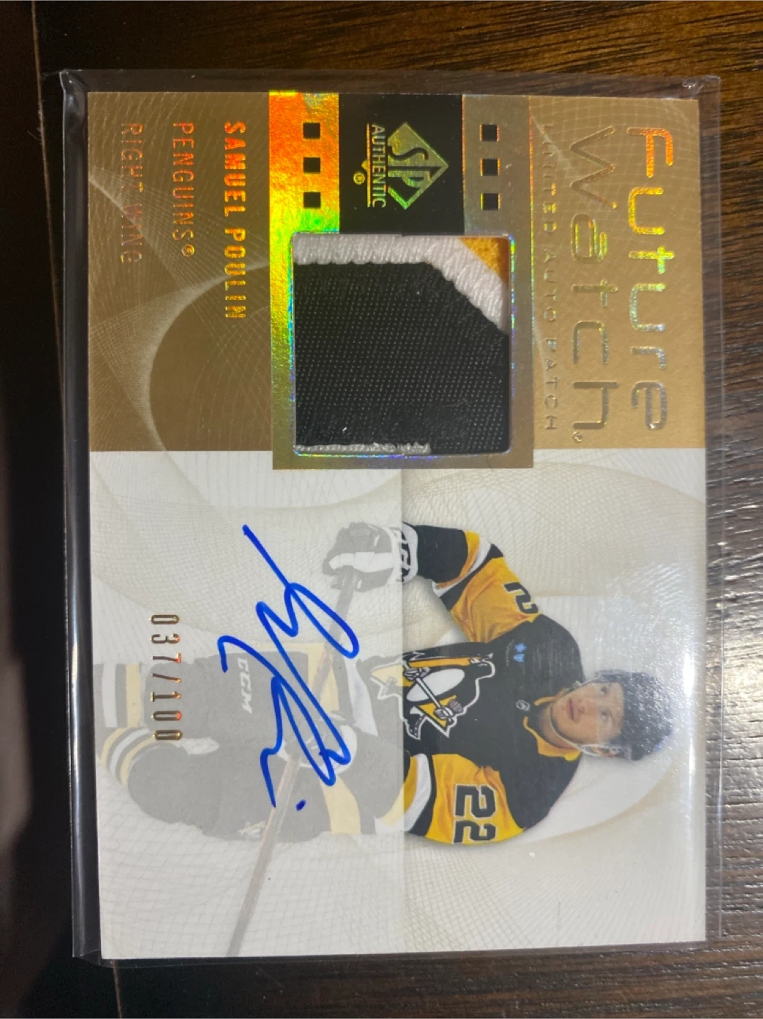 Selling a Samuel Poulin SP Authentic Future Watch Limited Auto Patch card. It's numbered 037/100 and features an autograph and patch from his jersey. Great for any hockey card collector!
