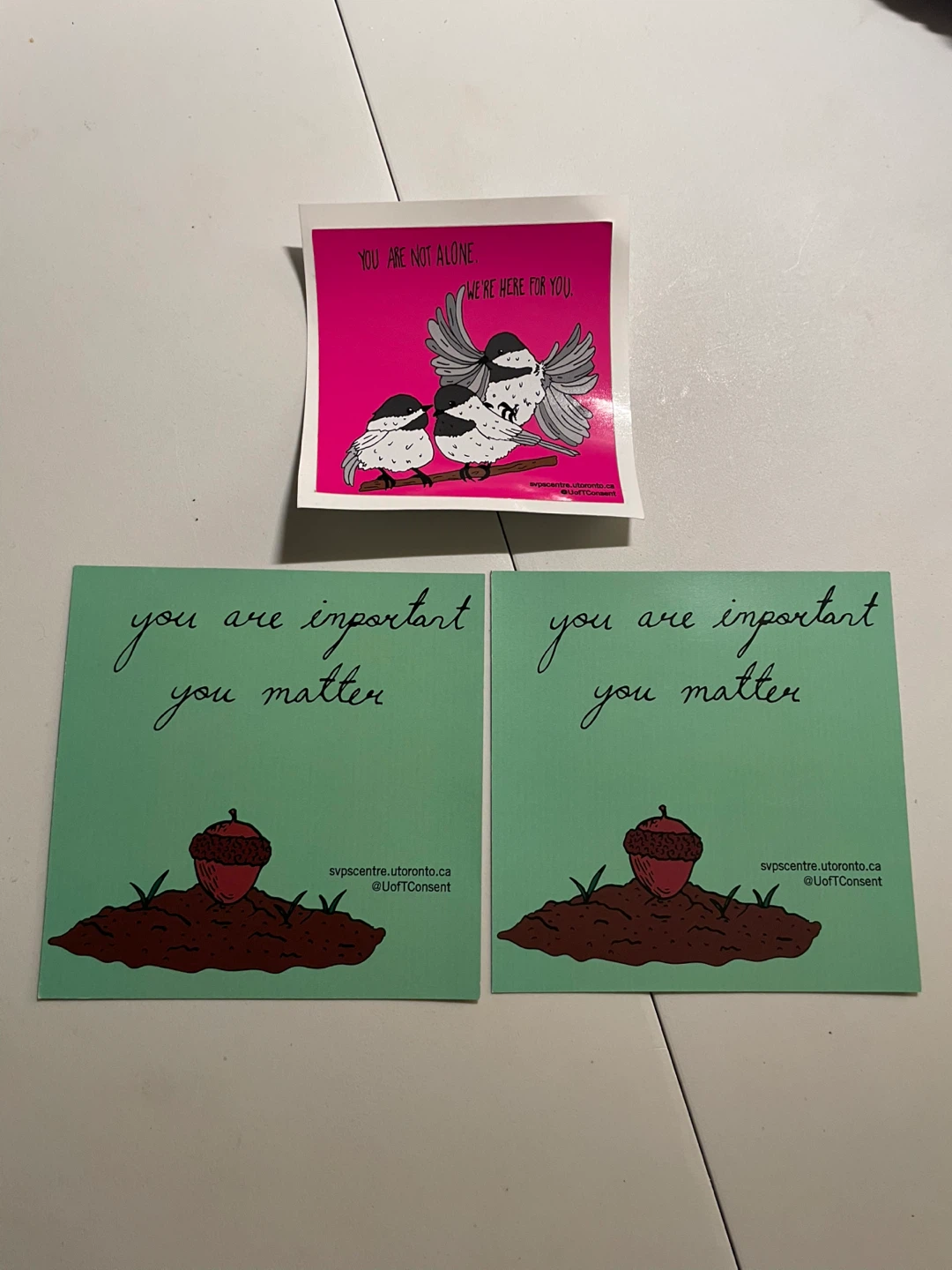 Selling a set of self-care magnets/stickers. One is a pink sticker with birds and the text "YOU ARE NOT ALONE. WE'RE HERE FOR YOU". The other two are green magnets that say "you are important you matter" with a picture of an acorn. I can also sell them individually if you want!